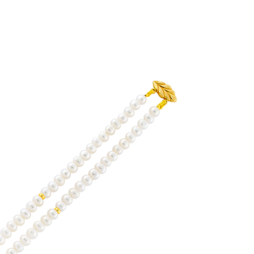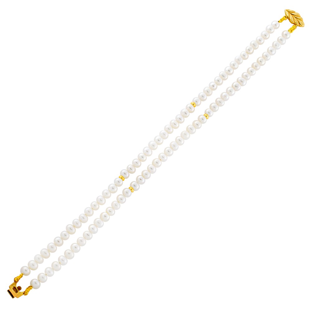 Βραχιόλι με δύο σειρές λευκά Fresh Water μαργαριτάρια 4-4,5 χιλιοστών, 4 βαρελάκια από κίτρινο χρυσό 14 καρατίων (585) και χρυσό κούμπωμα.