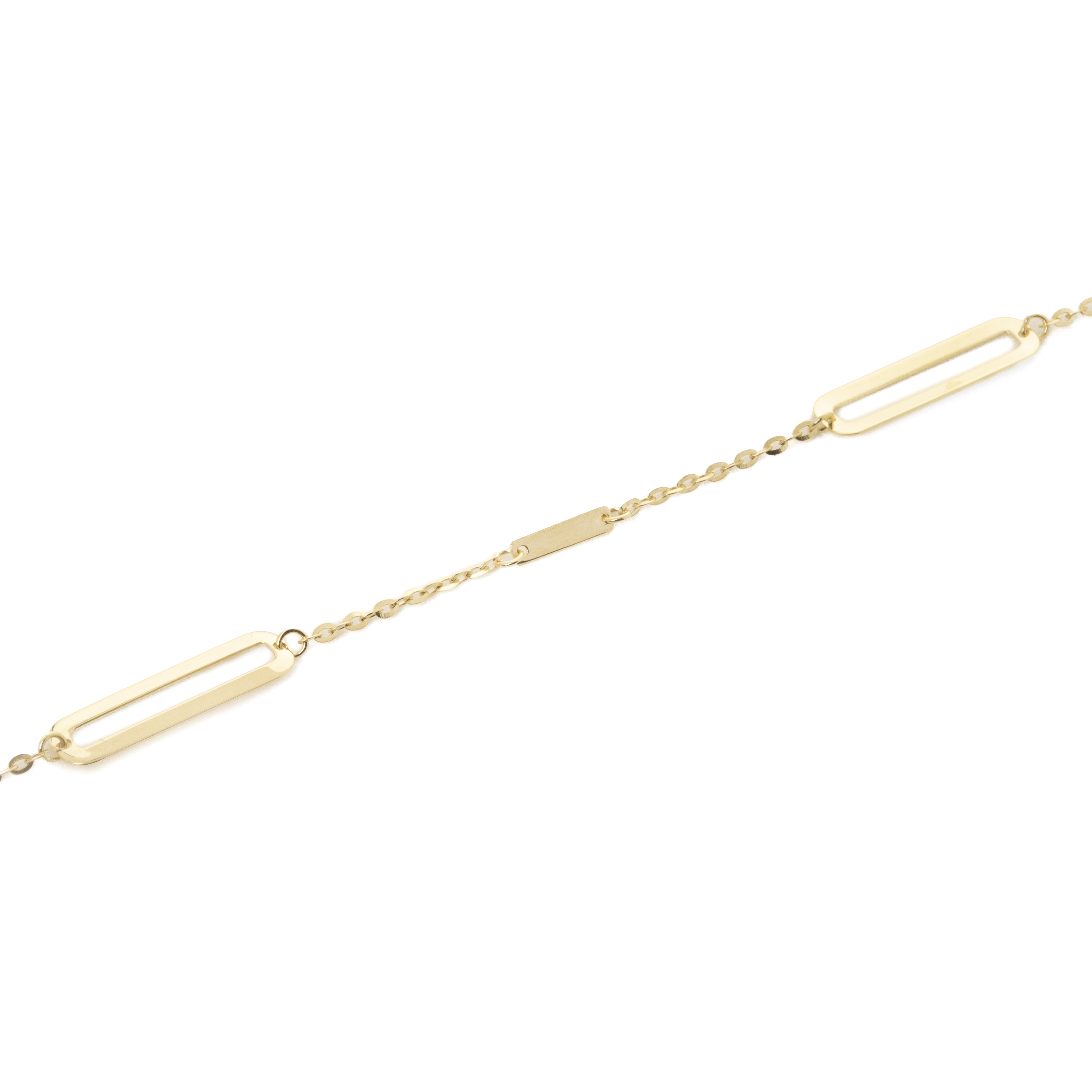 Μοντέρνο και minimal, γυαλιστερό (χωρίς κανένα ματ στοιχείο) βραχιόλι από χρυσό 9 καρατίων (κ 375) με charm σε σχήμα μακρόστενο.