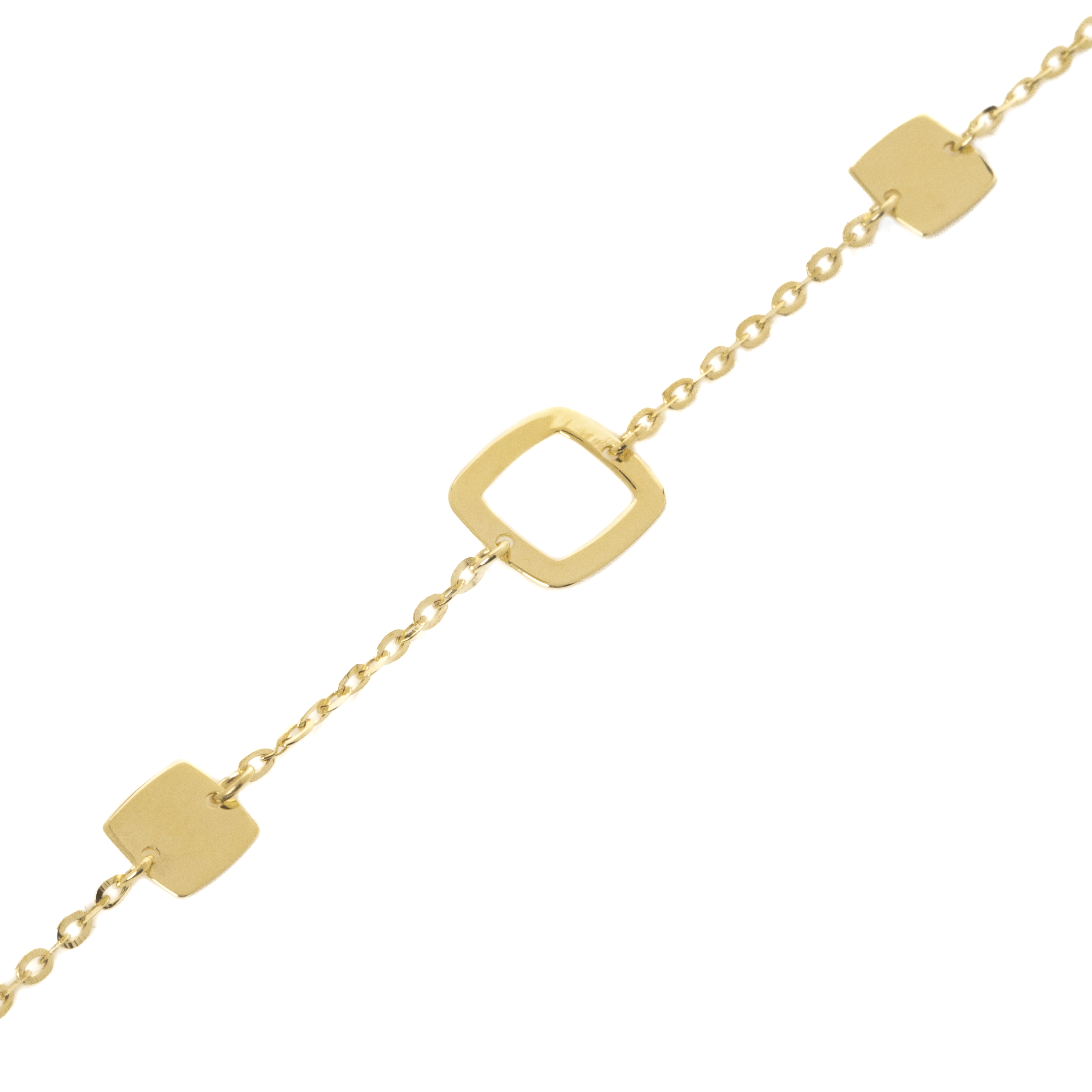 Μοντέρνο και minimal, γυαλιστερό (χωρίς κανένα ματ στοιχείο) βραχιόλι από χρυσό 9 καρατίων (κ 375) με charm σε σχήμα τετραγωνισμένο.