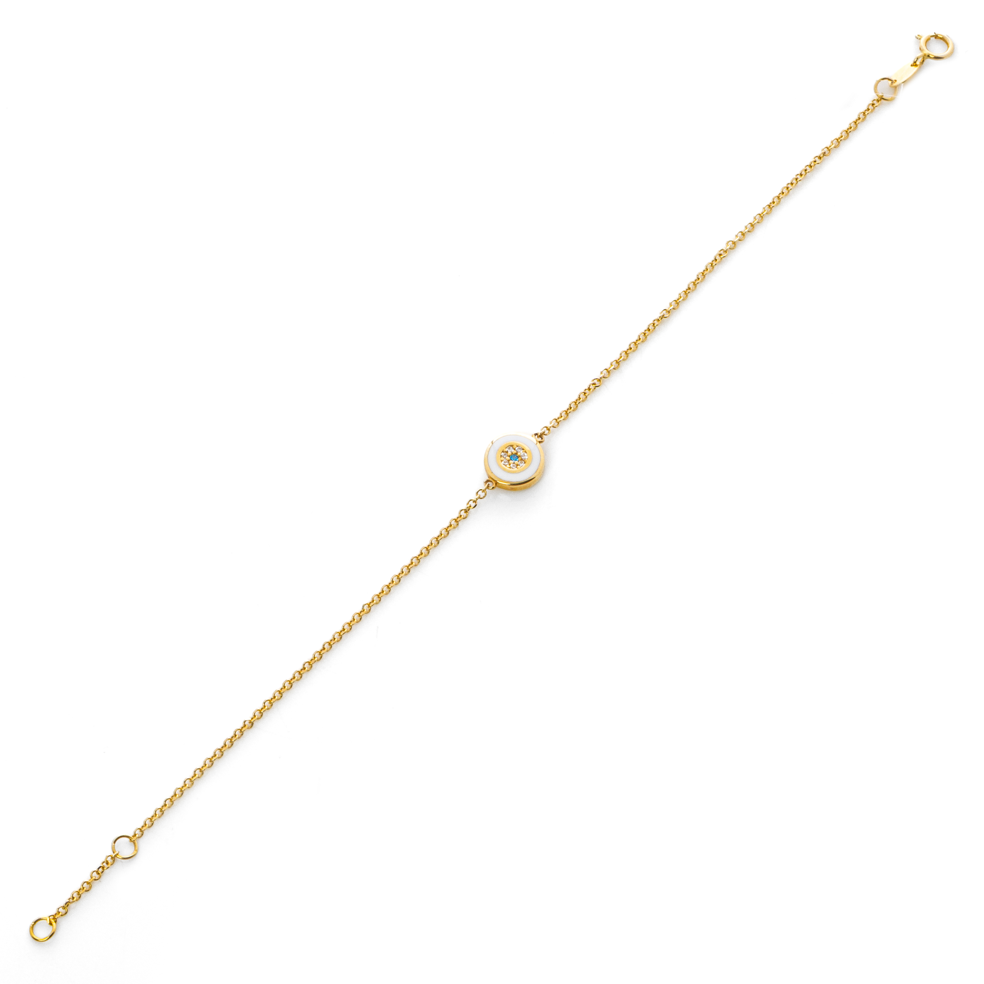 Βραχιόλι μάτι από κίτρινο χρυσό 14 καρατίων(585) διπλής όψης με λευκό σμάλτο από τη μία πλευρά και επιπλέον πέτρες από την άλλη. Το βραχιόλι κουμπώνει σε δύο μήκη.