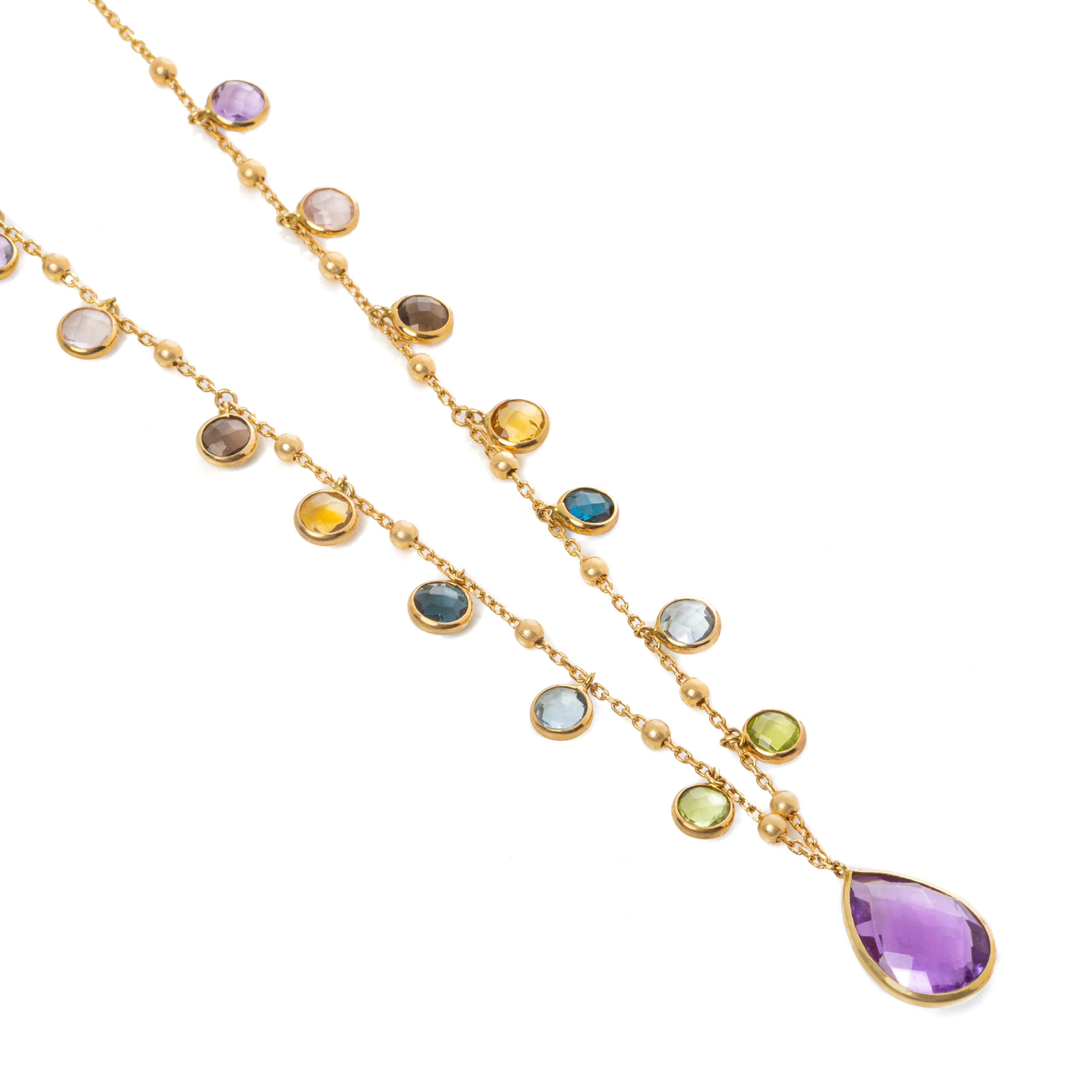 Εντυπωσιακό κολιέ από κίτρινο χρυσό 14 καρατίων (585) με διάφορες ορυκτές πέτρες (τοπάζ, αμέθυστους, σιτρίν, περίδοτους και αχάτες). Στο κέντρο τους κρέμεται ένας μεγαλύτερος αμέθυστος σε σχήμα δάκρυ.