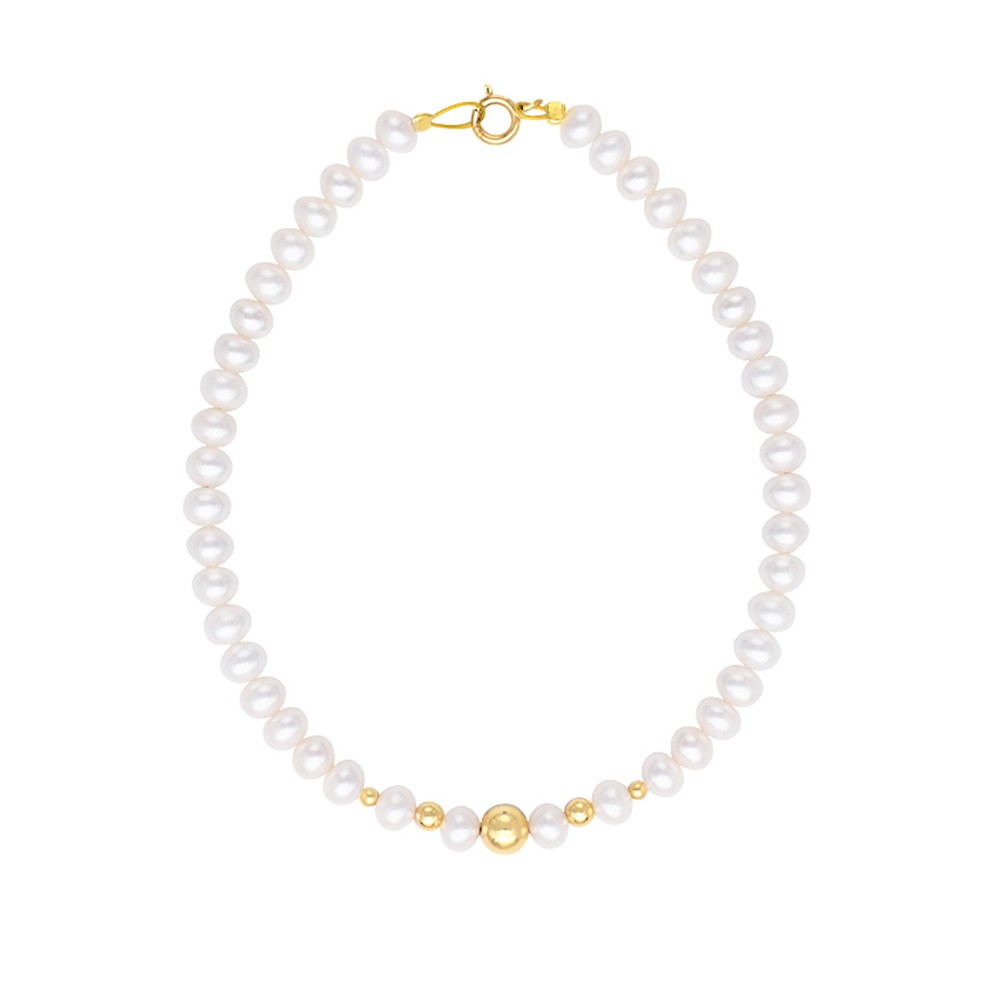 Διαχρονικό βραχιόλι με μαύρα Fresh Water Pearl 4-4,5 χιλιοστών, με κούμπωμα από κίτρινο χρυσό 14 καρατίων(585). Στο κέντρο του υπάρχουν 5 χρυσές μπίλιες και αυτές 14 καρατίων(585), στο κέντρο μία μεγαλύτερη και μικρότερες στο πλάι.
