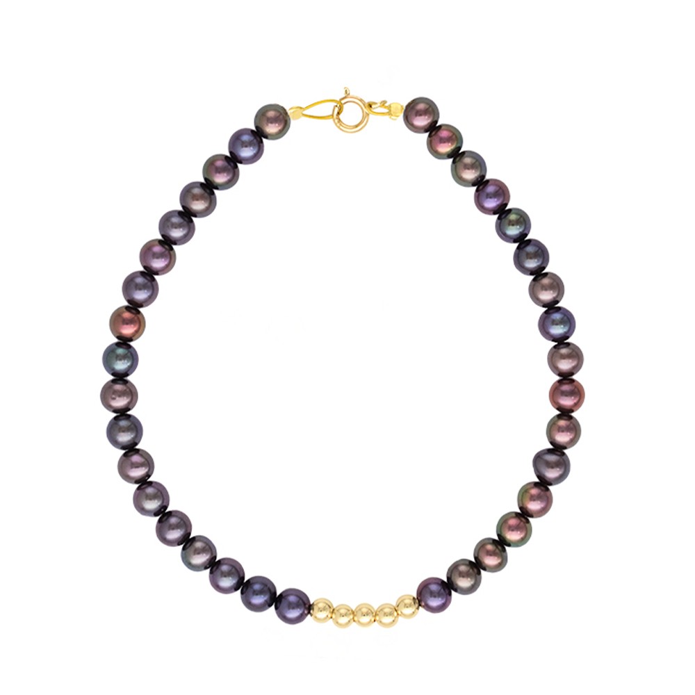 Διαχρονικό βραχιόλι με μαύρα Fresh Water Pearl 4,5-5 χιλιοστών, με κούμπωμα από κίτρινο χρυσό 14 καρατίων(585). Στο κέντρο του υπάρχουν 5 χρυσές μπίλιες και αυτές 14 καρατίων(585).