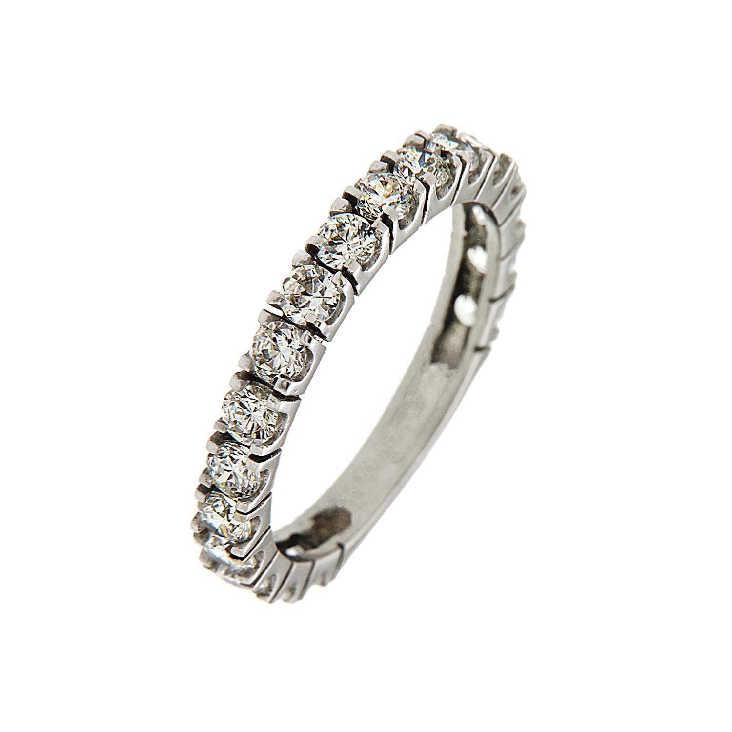 Δαχτυλίδι ολόβερο, γυαλιστερό σε λευκόχρυσο 14 καρατίων (κ585). Αποτελείται από μία σειρά με δεκαοκτώ πέτρες ζιργκόν εξαιρετικής ποιότητας, που δίνουν στο κόσμημα αστραφτερή λάμψη.