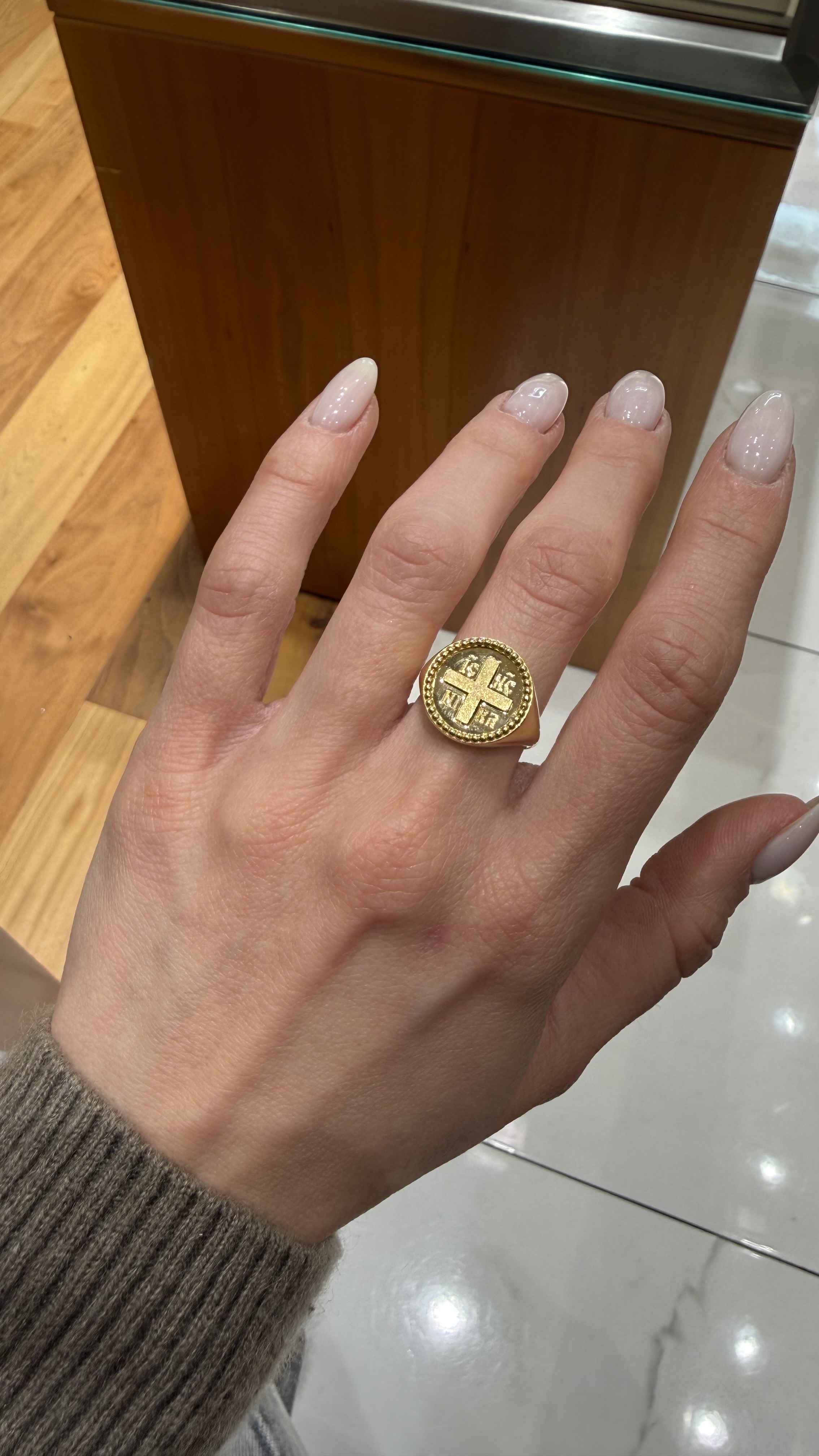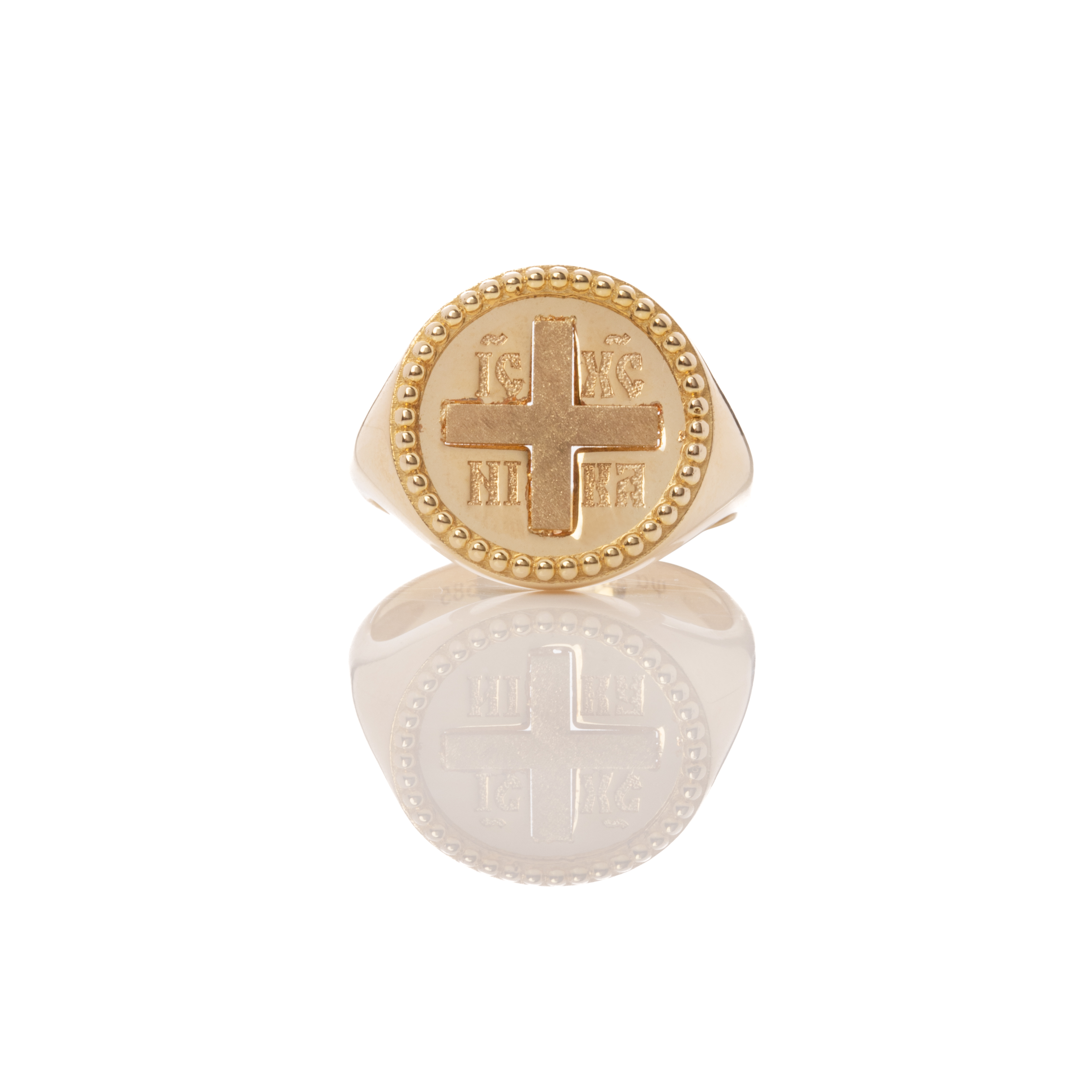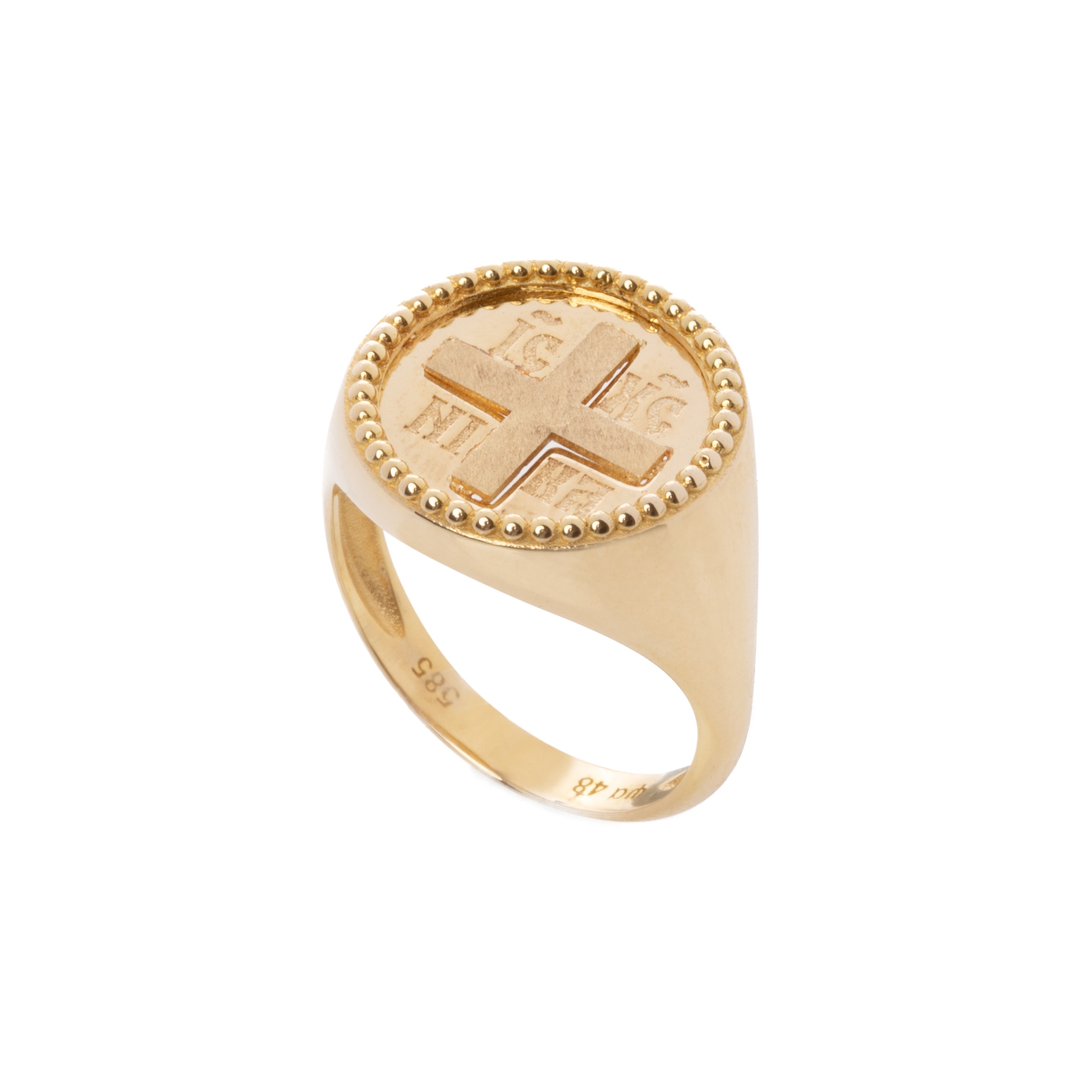 Διαχρονικό δαχτυλίδι από κίτρινο χρυσό 14 καρατίων (585) με σκάλισμα από κωνσταντινάτο στην επιφάνειά του.