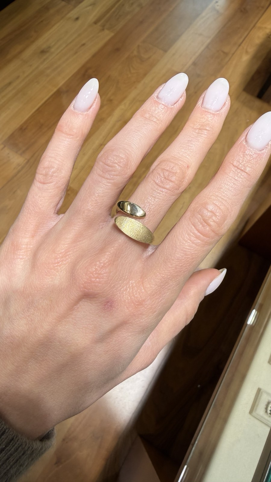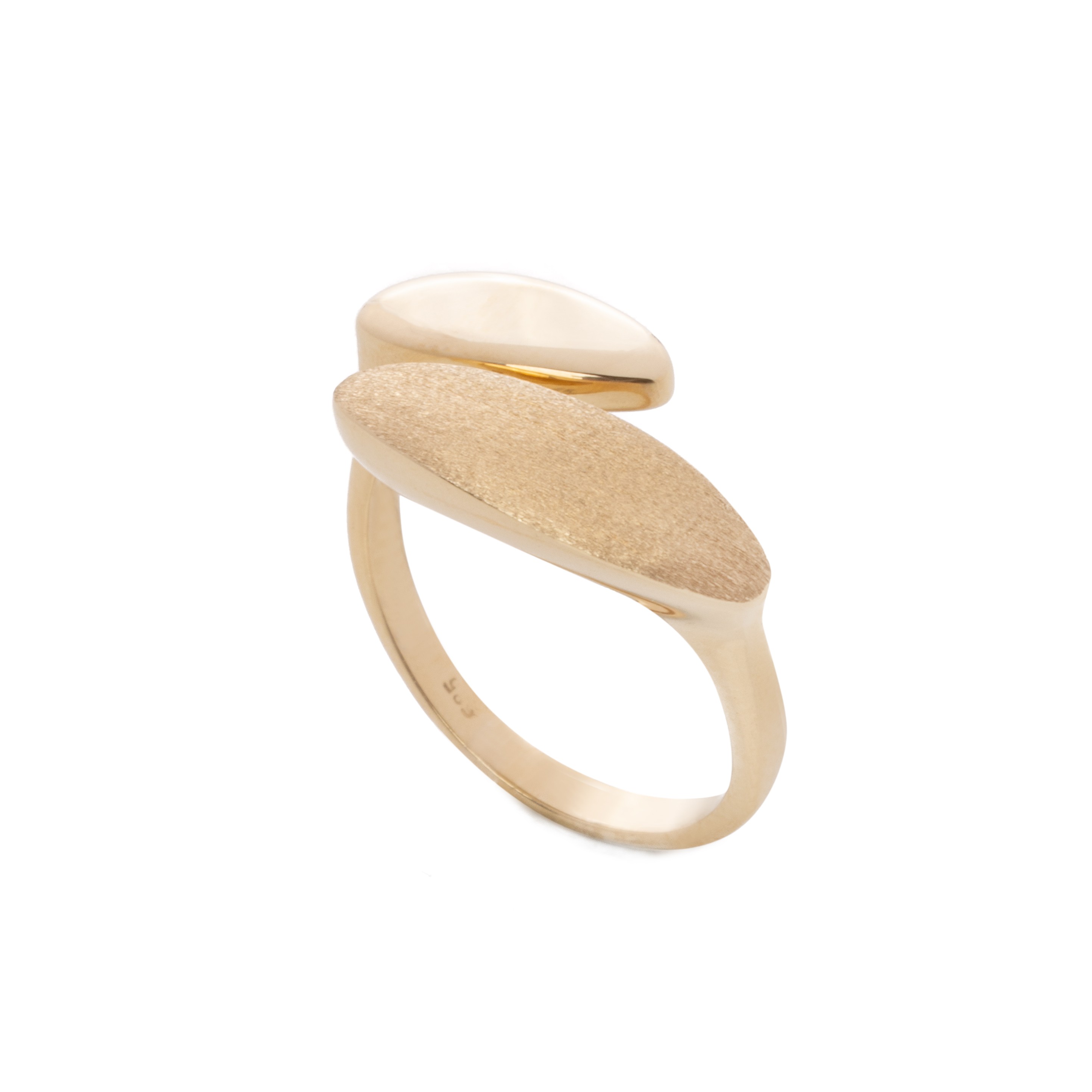 Ιδιαίτεα εντυπωσιακό δαχτυλίδι από κίτρινο χρυσό 14 καρατίων, σκέτο , χωρίς πέτρες. Στο επάνω του τμήμα είναι μισό ματ και μισό γυαλιστερό.
