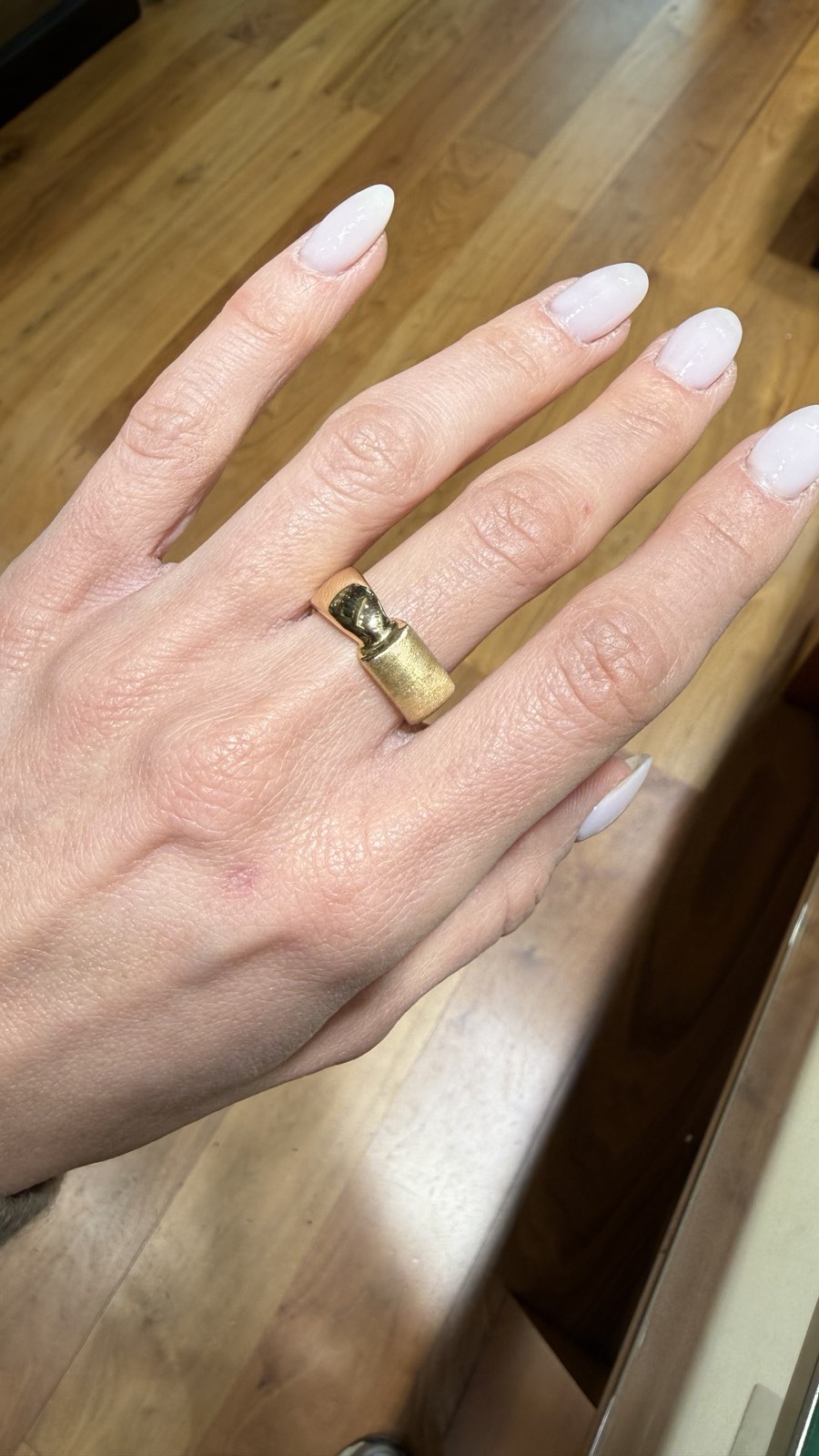 Ιδιαίτεα εντυπωσιακό δαχτυλίδι από κίτρινο χρυσό 14 καρατίων, σκέτο , χωρίς πέτρες. Στο επάνω του τμήμα είναι μισό ματ και μισό γυαλιστερό.