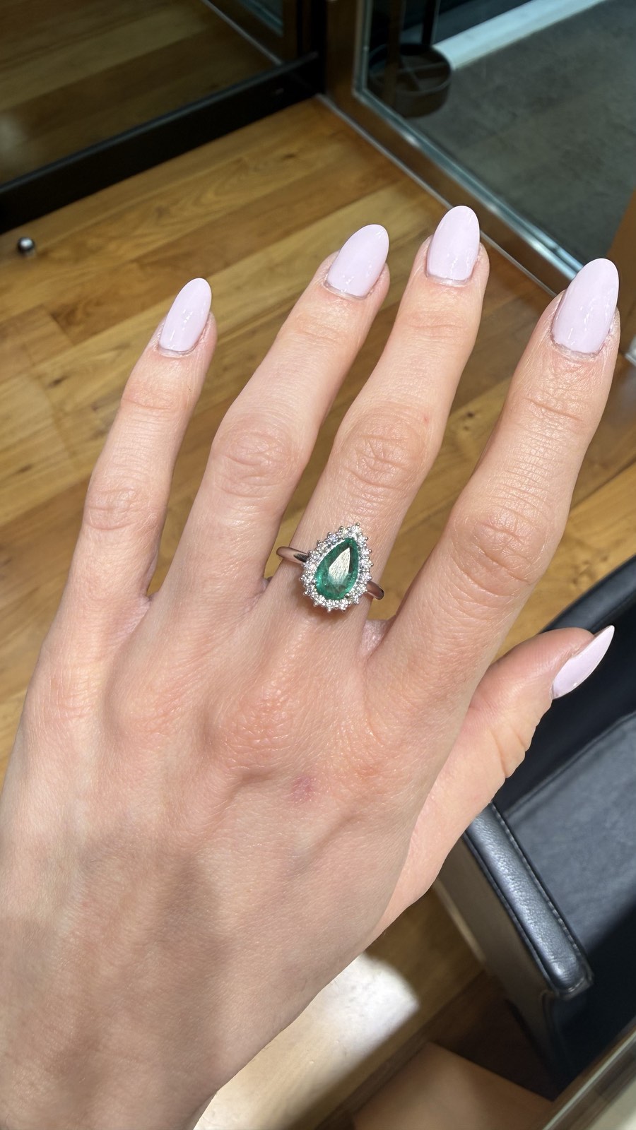 Εντυπωσιακό δαχτυλίδι από λευκόχρυσο 18 καρατίων με αστραφτερά διαμάντια και ορυκτό σμαράγδι κοπής pear στο κέντρο του.