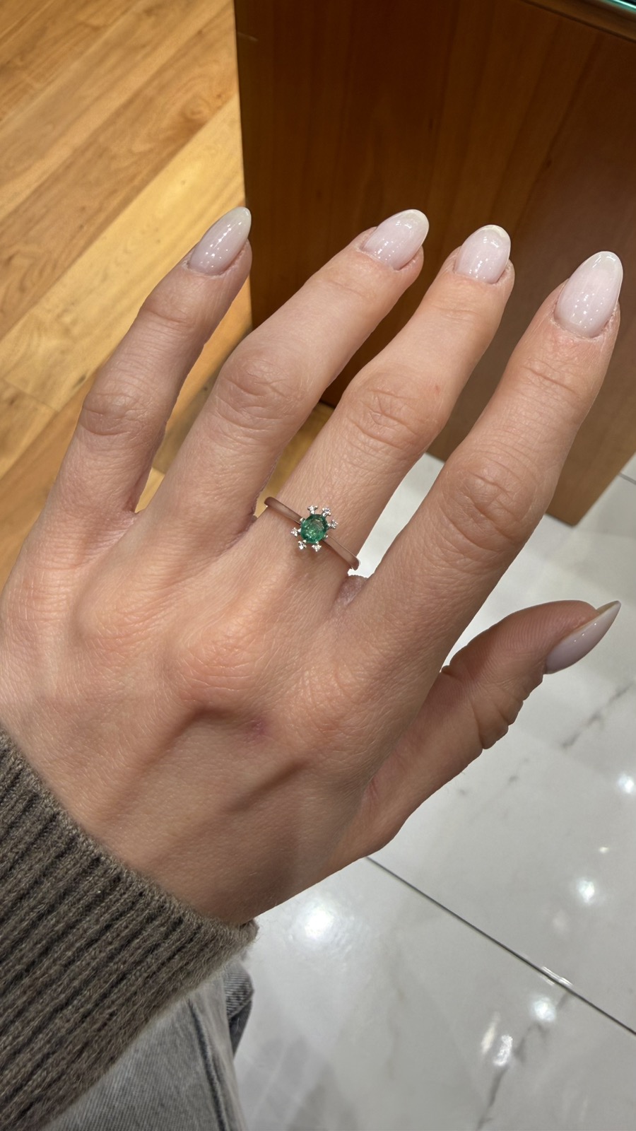 Εντυπωσιακό δαχτυλίδι από λευκόχρυσο 18 καρατίων με μία ορυκτή πέτρα, σμαράγδι, σε οβάλ κοπή και γύρω του διαμάντια.