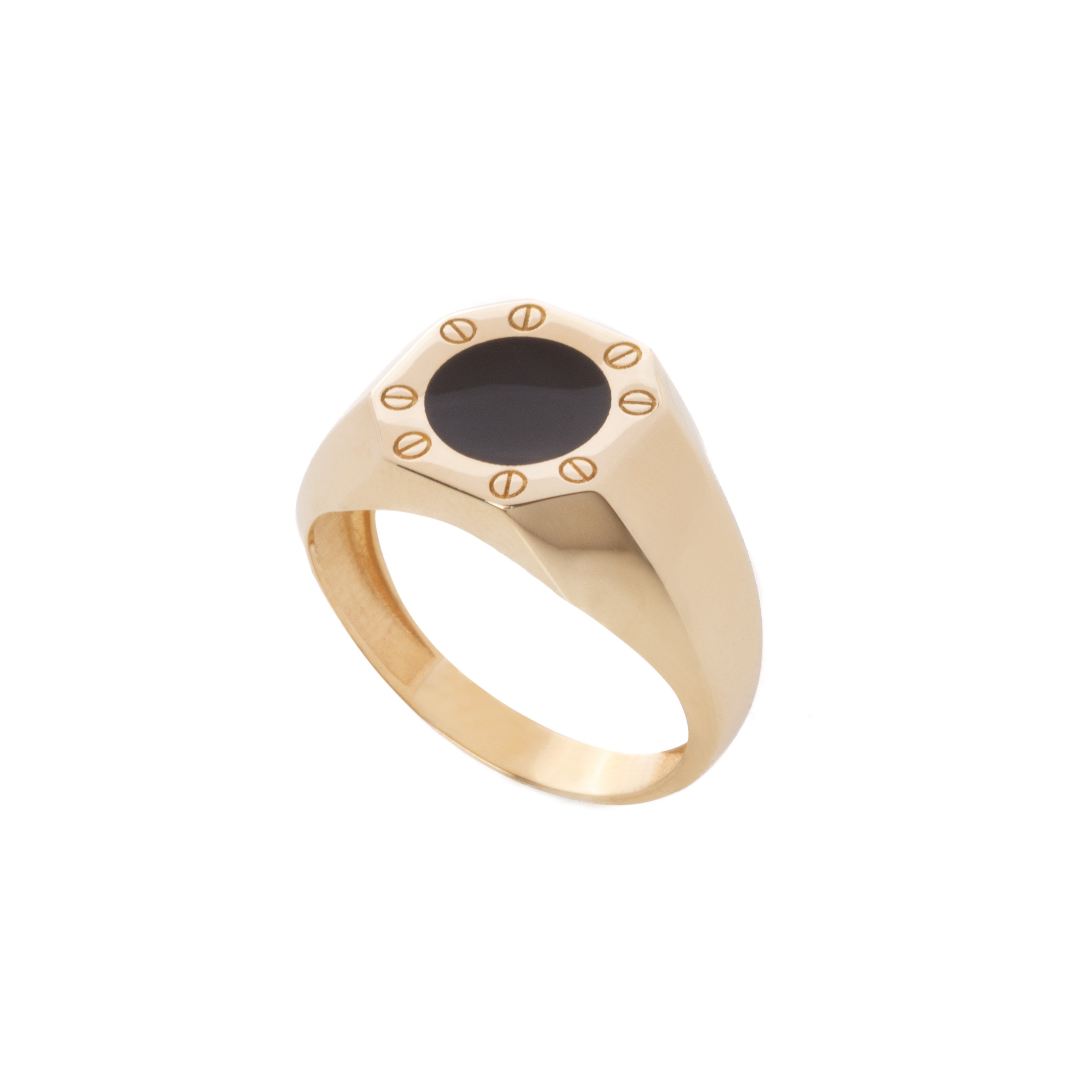 Ιδιαίτερο και εντυπωσιακό ανδρικό δαχτυλίδι σε οκτάγωνο σχήμα από κίτρινο χρυσό 14 καρατίων. Στο κέντρο του περιέχει πέτρα, ορυκτό όνυχα, σε μαύρο χρώμα και στο γύρω του διακριτικό σκάλισμα.