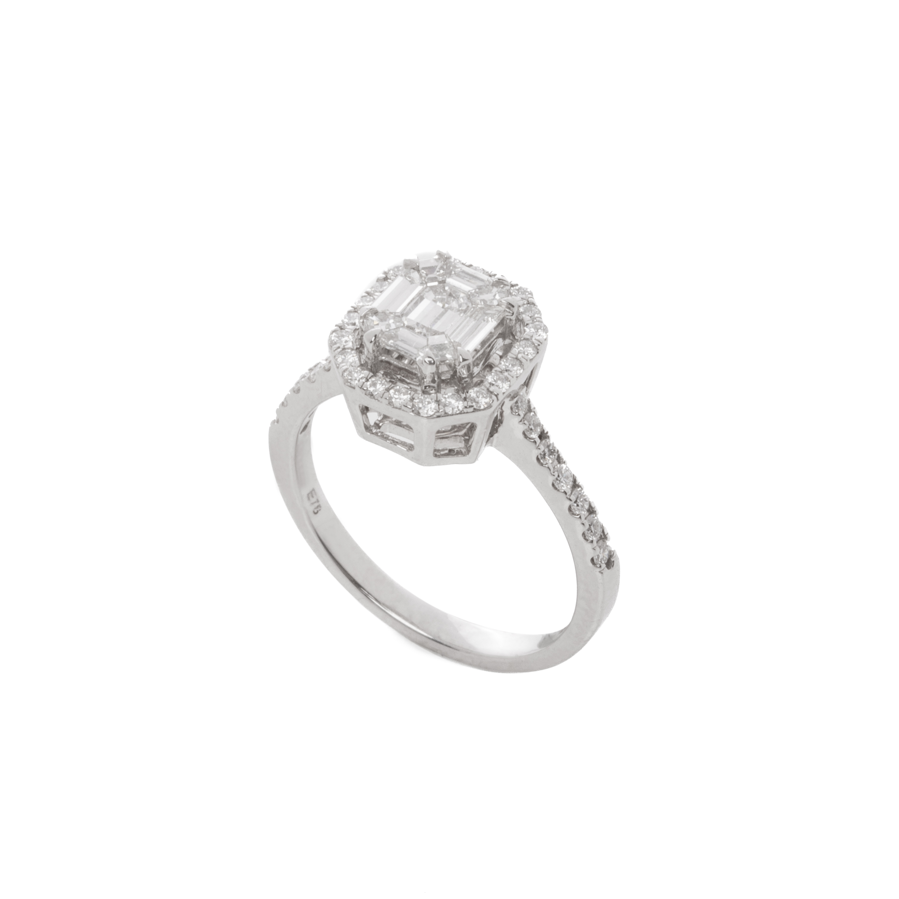 Εντυπωσιακό δαχτυλίδι από λευκόχρυσο 18 καρατίων (750). Το δαχτυλίδι είναι πολύπειρο με διαμάντια και σχηματίζει ροζέτα σε οκτάγωνο σχήμα.