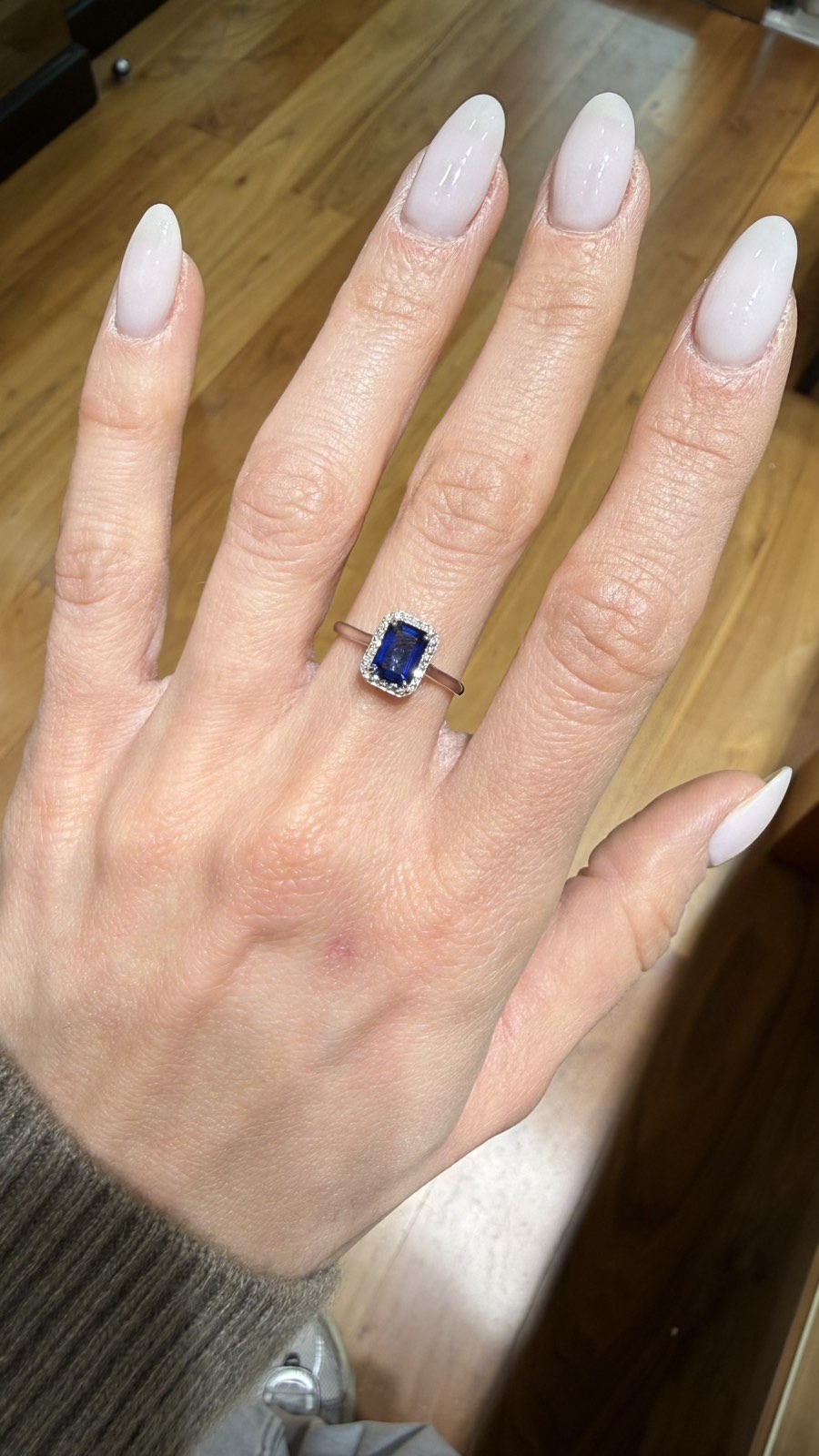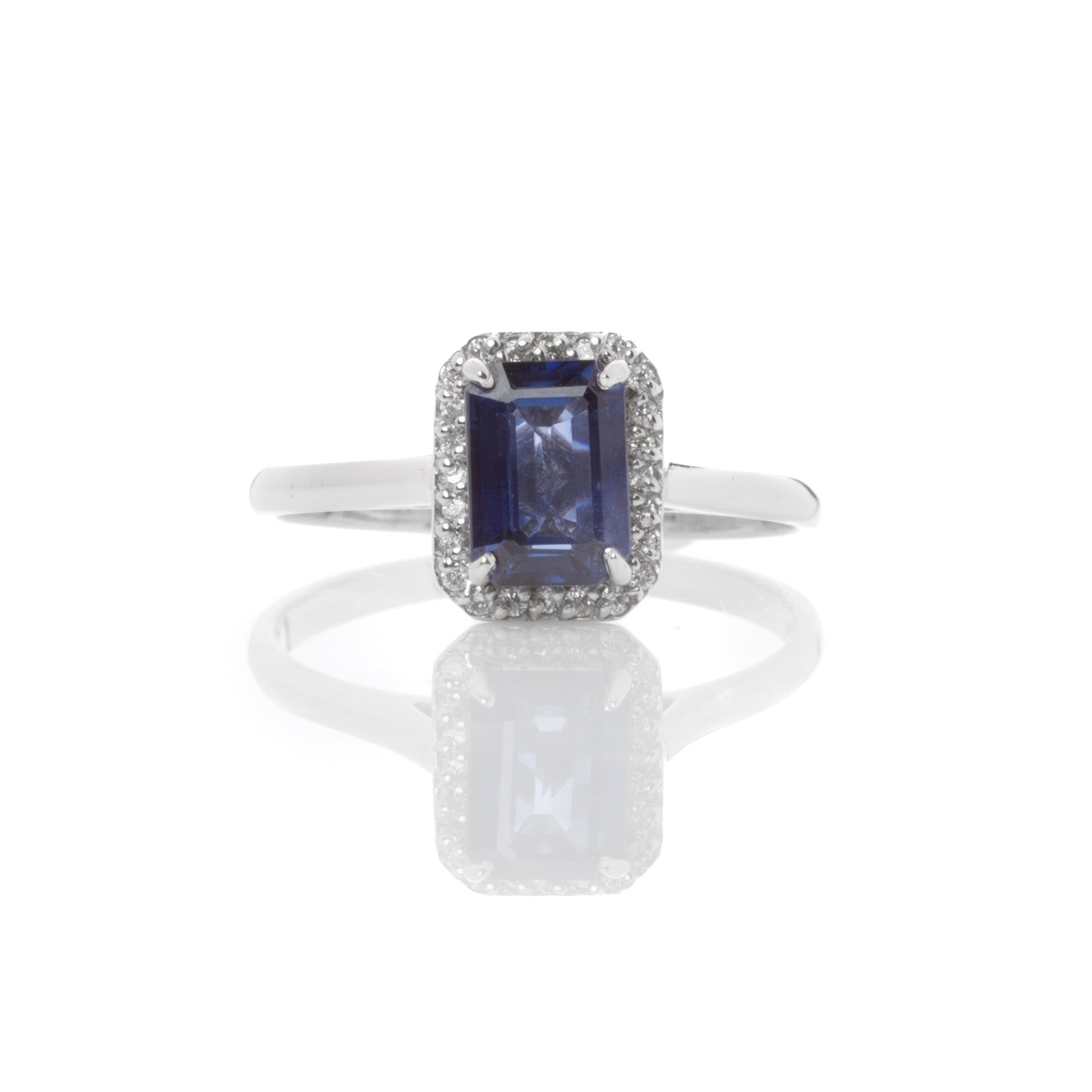 Εντυπωσιακό δαχτυλίδι ροζέτα από λευκόχρυσο 18 καρατίων με αστραφτερά διαμάντια του ίδιου μεγέθους που σχηματίζουν ορθογώνιο και στο κέντρο τους υπάρχει ένα ορυκτό ζαφείρι σε μπλε χρώμα κοπής emerald.