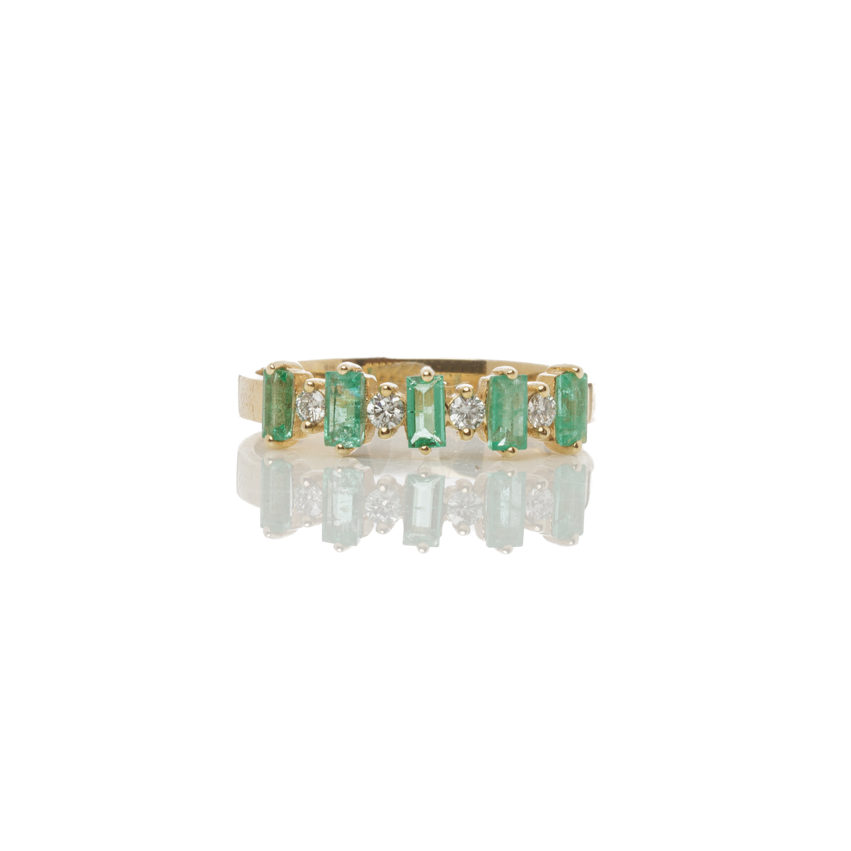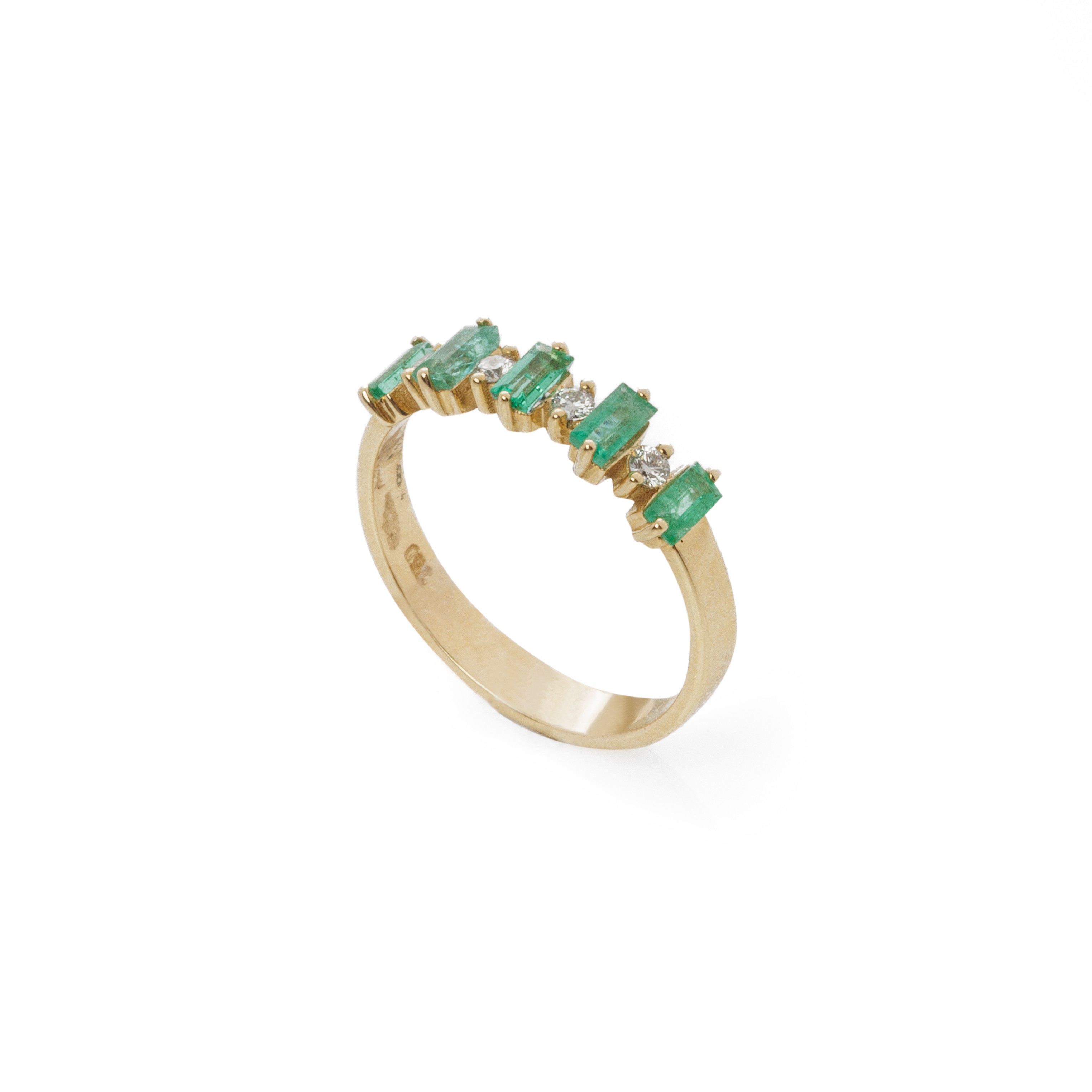 Εντυπωσιακό δαχτυλίδι από κίτρινο χρυσό 18 καρατίων με αστραφτερά διαμάντια και ορυκτά σμαράγδια.