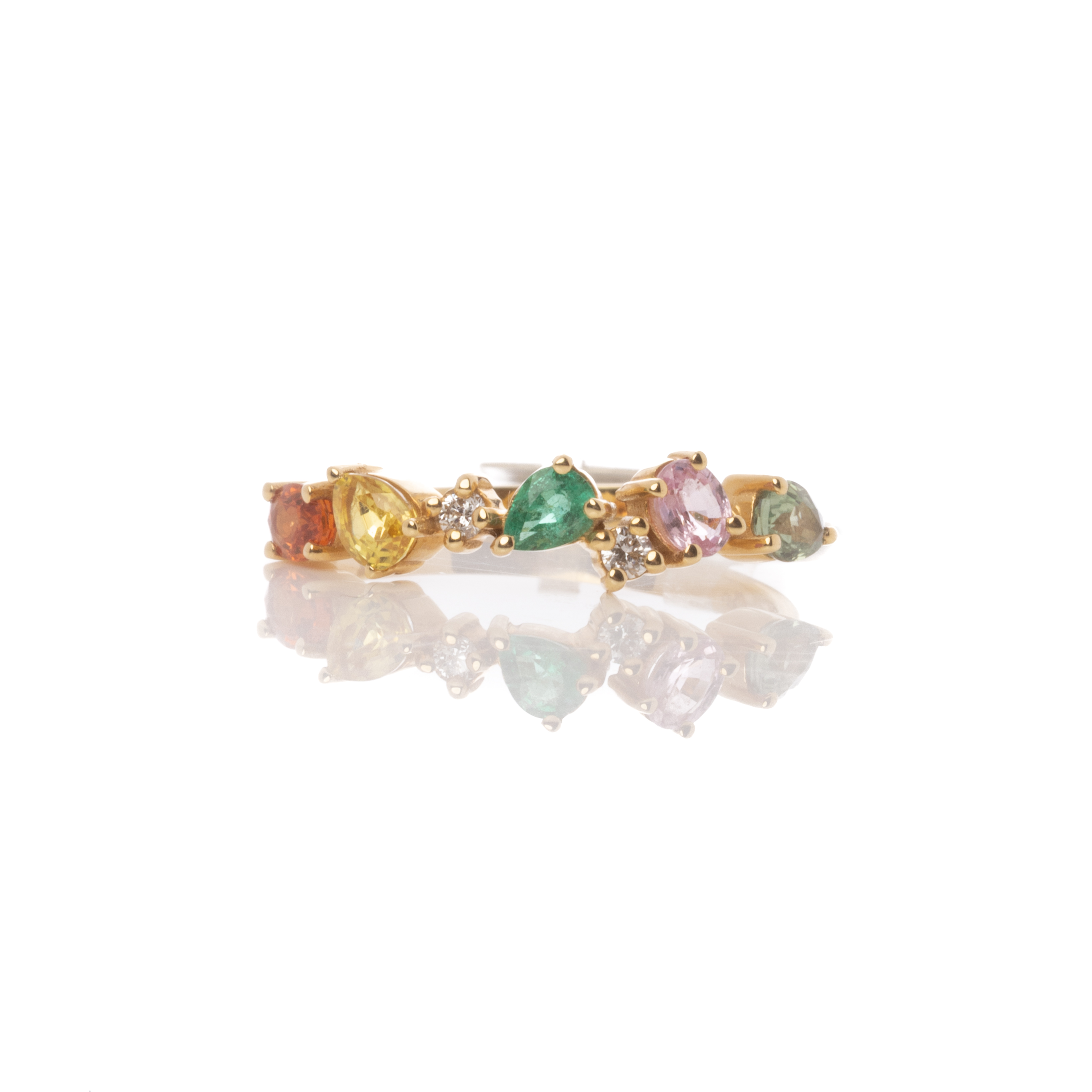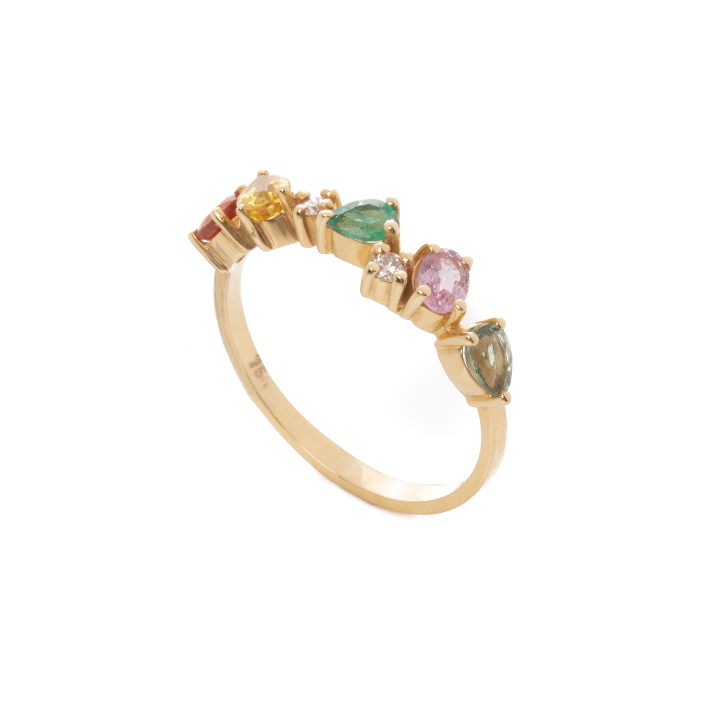 Εντυπωσιακό δαχτυλίδι από κίτρινο χρυσό 18 καρατίων με αστραφτερά διαμάντια και ορυκτά χρωματιστά ζαφείρια και ένα σμαράγδι.