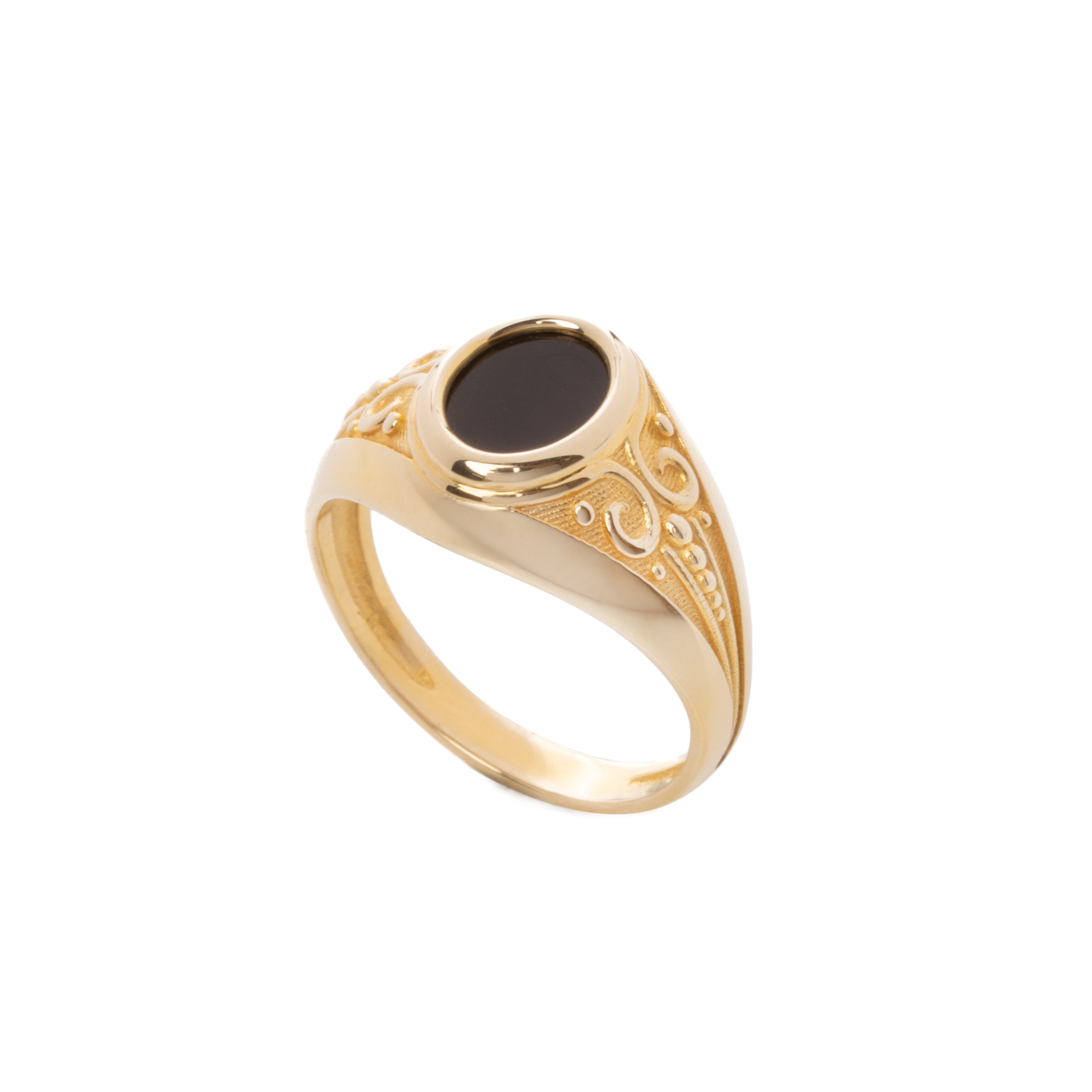 Ιδιαίτερο και εντυπωσιακό ανδρικό δαχτυλίδι από κίτρινο χρυσό 14 καρατίων. Στο κέντρο του περιέχει πέτρα, ορυκτό όνυχα, σε μαύρο χρώμα και στο πλάι εντυπωσιακό σκάλισμα.