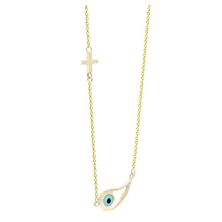 Μοντέρνο κολιέ μάτι σε σχήμα δάκρυ και σταυρό σκέτο από κίτρινο χρυσό 14 καρατίων. Τα δύο κρεμαστά είναι ενσωματωμένα επάνω στην αλυσίδα.