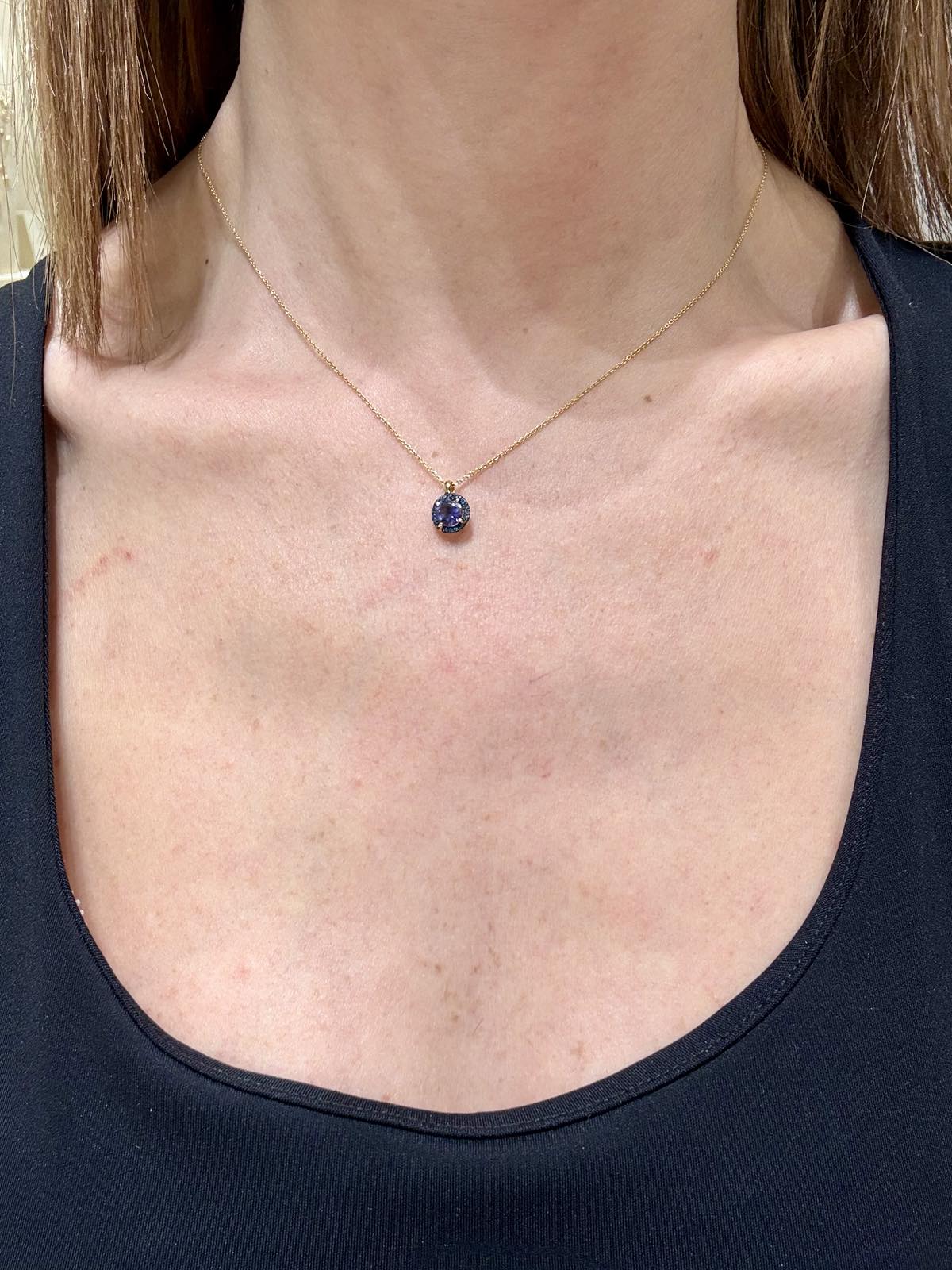 Διαχρονικό κολιέ από λευκόχρυσο 18 καρατίων (750) με διαμάντια και στο κέντρο ιολίτης κοπής round σε πολύ καλή ποιότητα και χρώμα.