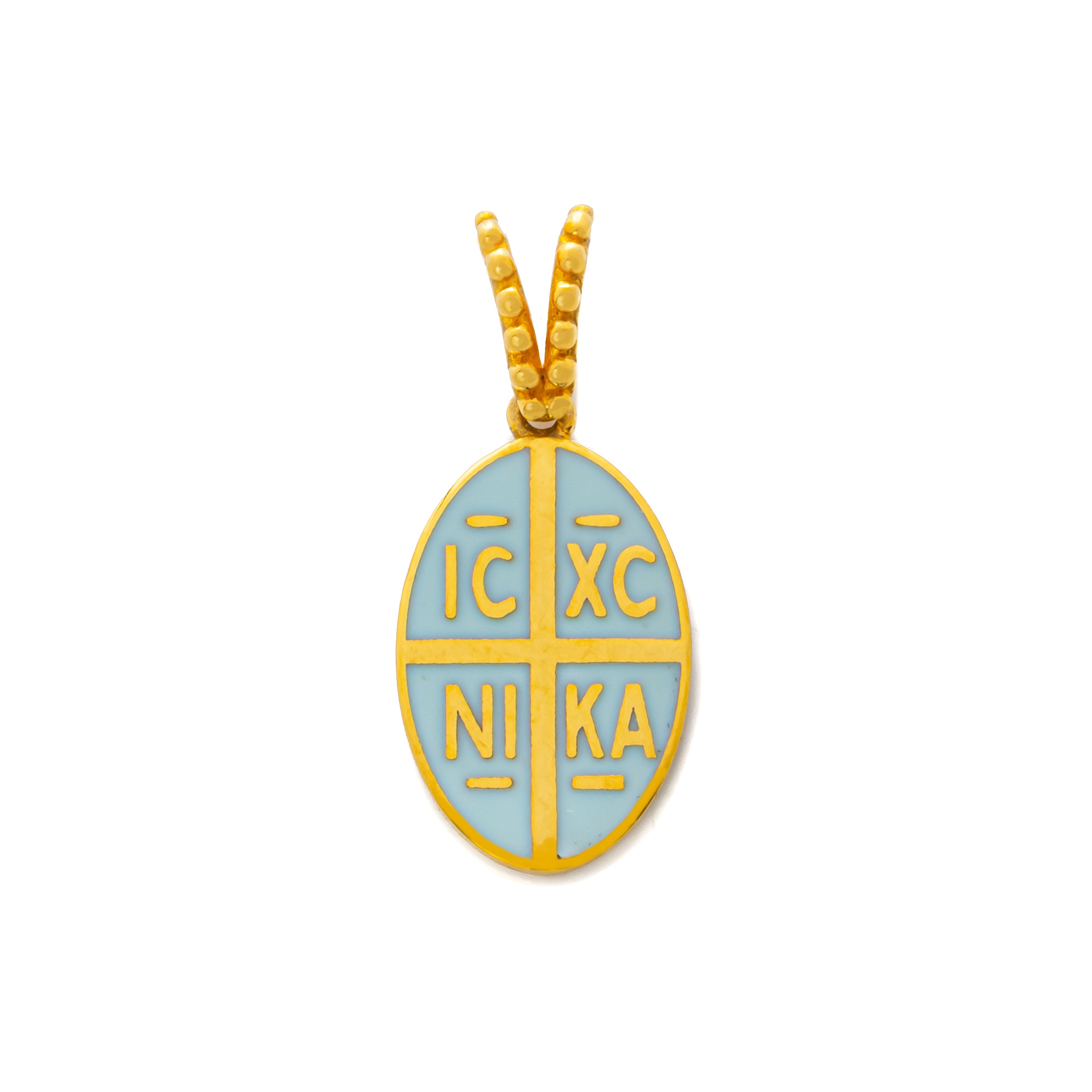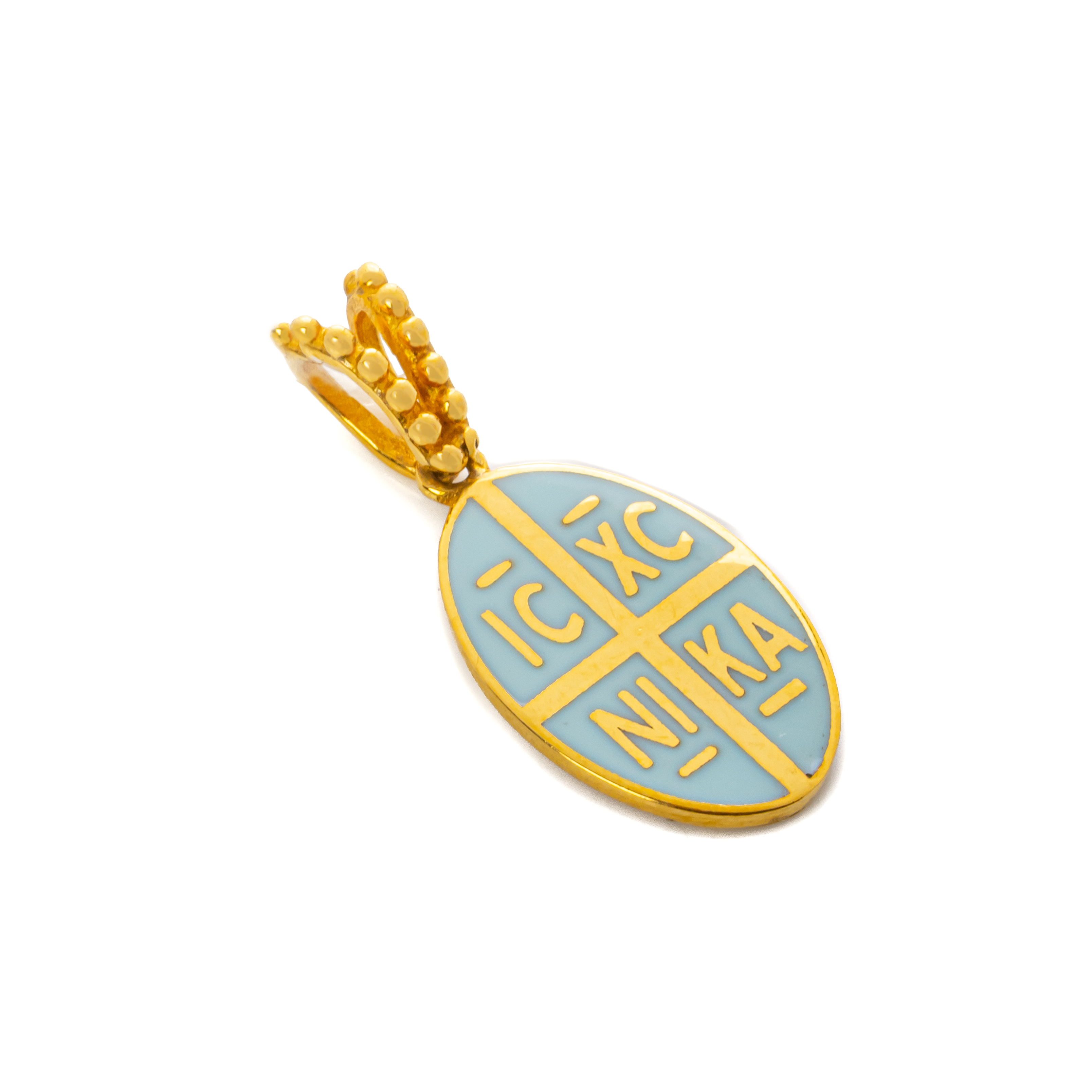 Κωνσταντινάτο από κίτρινο χρυσό 9 καρατίων (375) με σμάλτο, σε οβάλ σχήμα. Το κωνσταντινάτο έχει διαστάσεις 1.43 (2.20cm με τον κρίκο) X 0.95 cm.