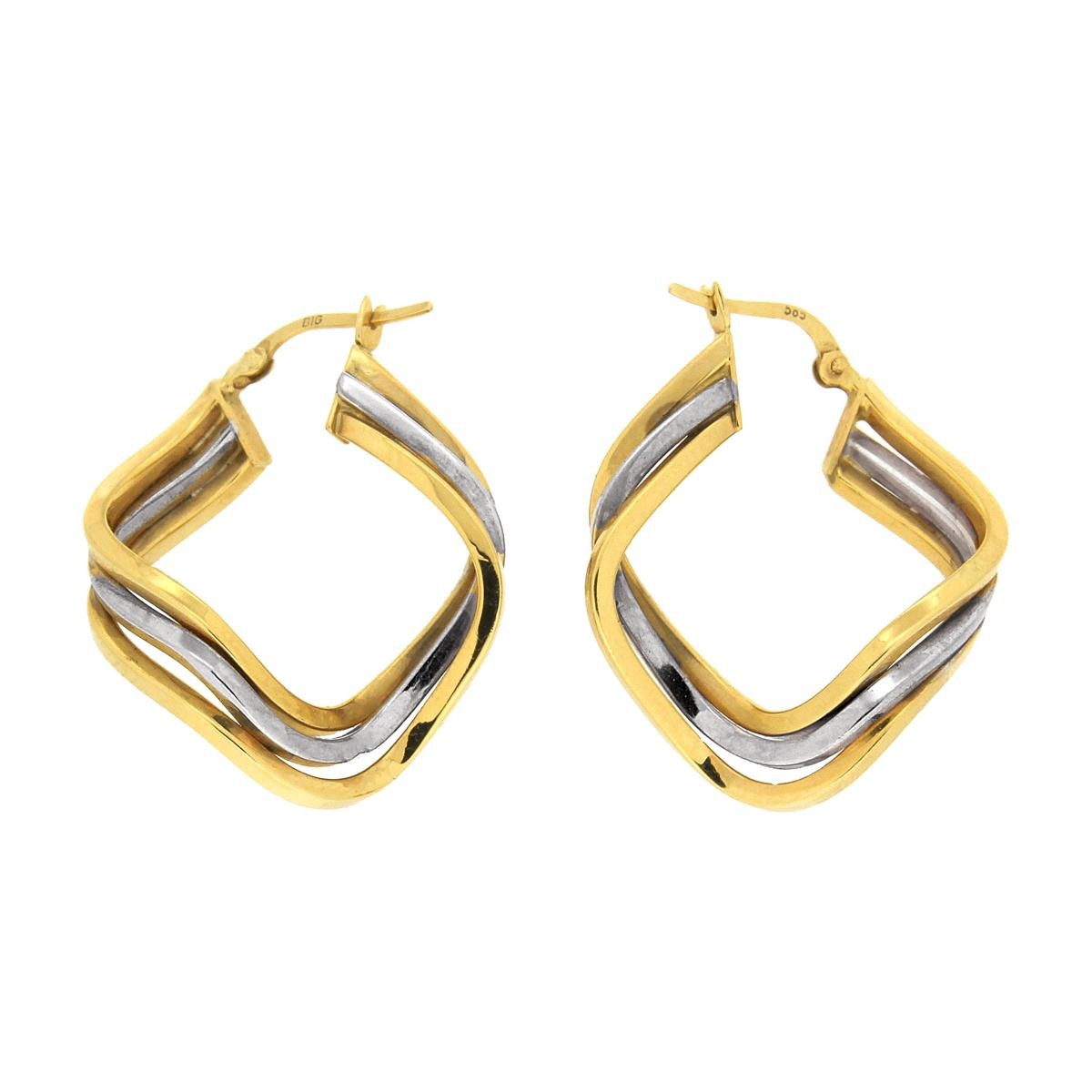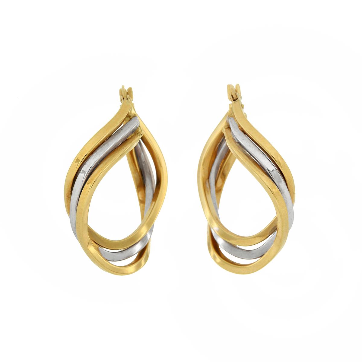Εντυπωσιακοί, γυαλιστεροί, σκέτοι κρίκοι από χρυσό 14 καρατίων (585). Το σκουλαρίκι αποτελείται από τρεις κρίκους ενωμένους μεταξύ τους, με κενό ανάμεσά τους, όπου ο κεντρικός είναι σε λευκόχρυσο και οι άλλοι δύο σε χρυσό. Το κούμπωμά τους είναι ασφαλείας, περαστό από το αυτί. Οι κρίκοι αποτελούν ένα διαχρονικό κόσμημα, για όλες τις ώρες και πολύ εύκολο στο συνδυασμό τους με άλλα κοσμήματα.