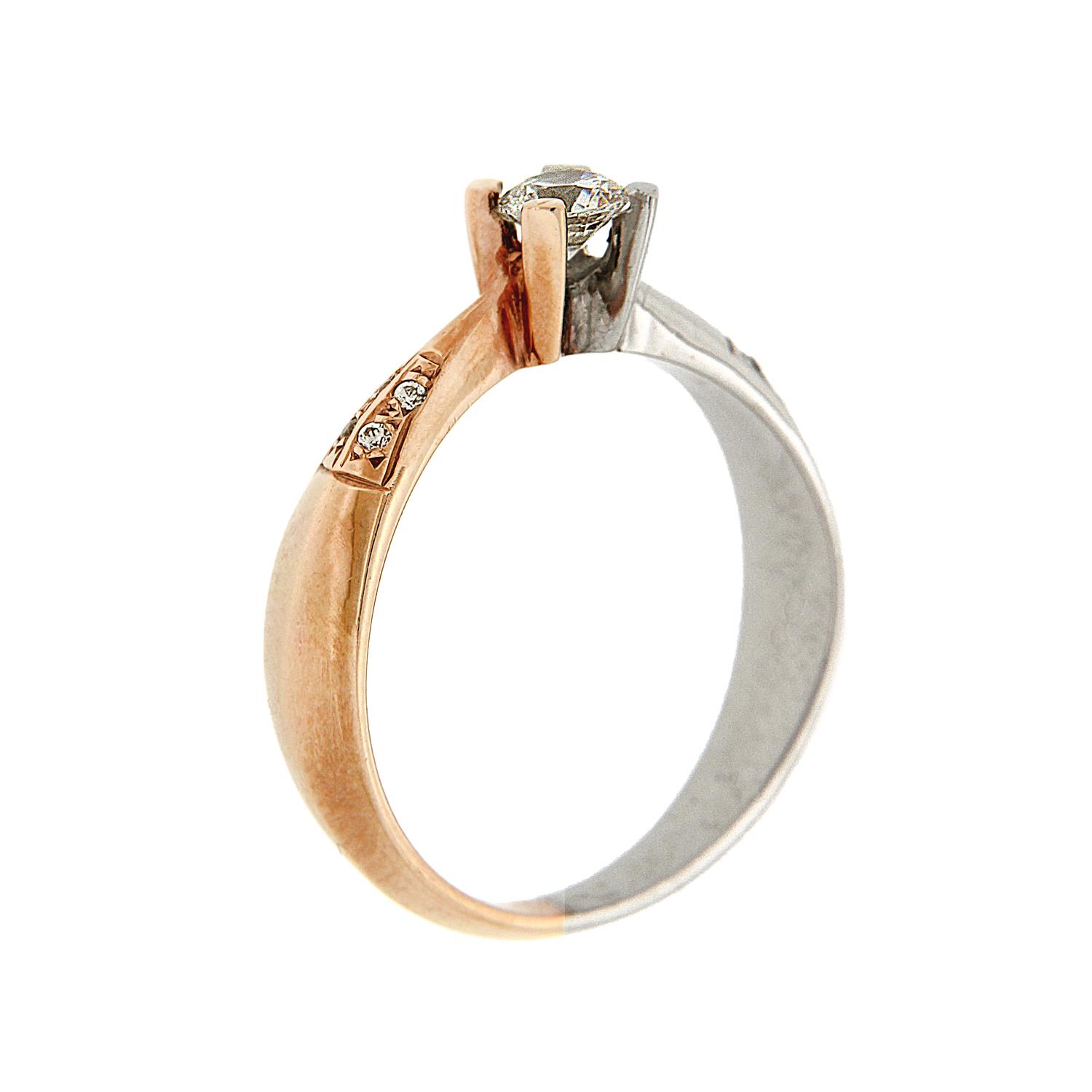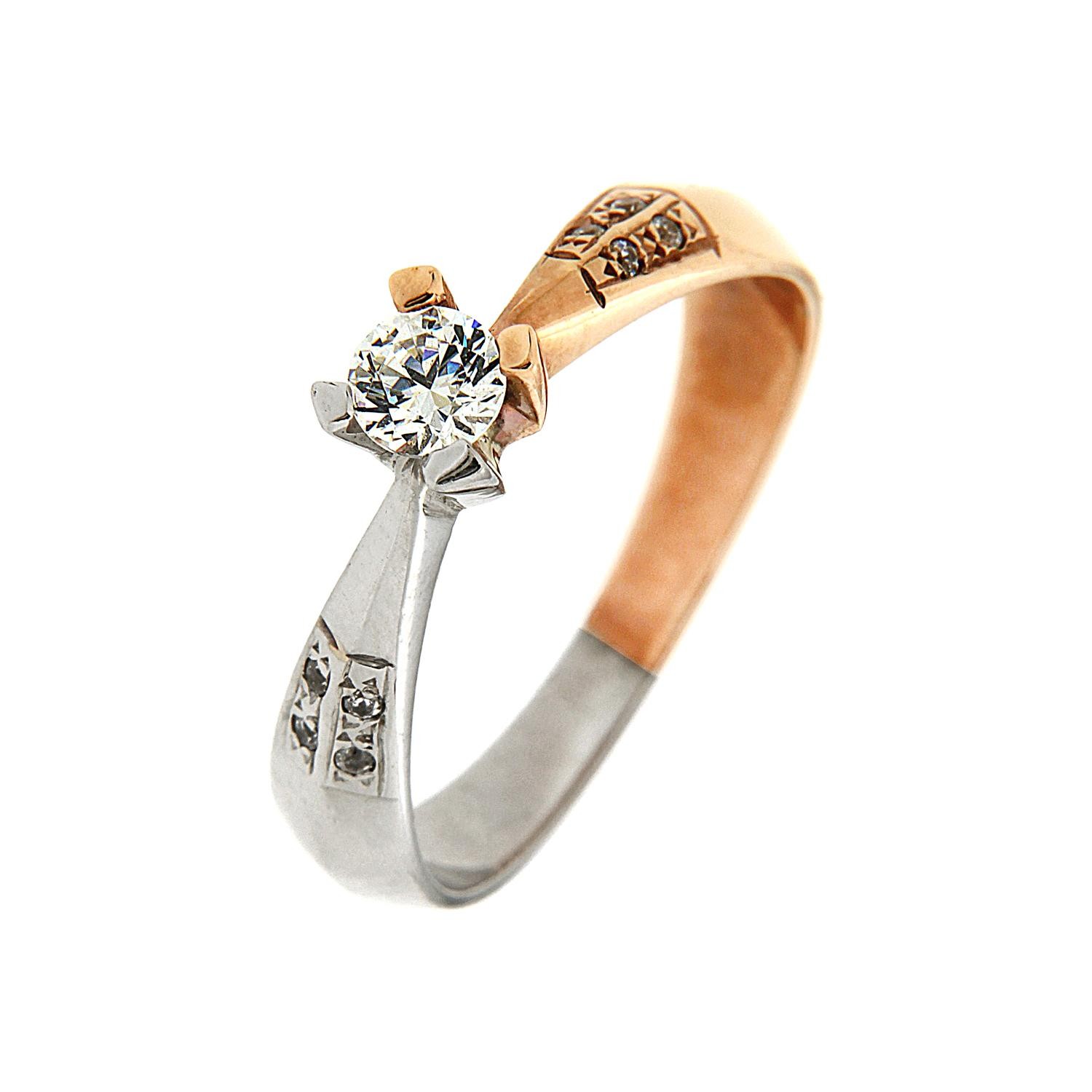 Μονόπετρο δαχτυλίδι μοντέρνο με γυαλιστερή βάση δίχρωμο από λευκόχρυσο και ροζ χρυσό 14 καρατίων. Περιλαμβάνει μία μεγάλη πέτρα ζιργκόν στο κέντρο άριστης ποιότητας η οποία στηρίζεται από τέσσερα δοντάκια και οκτώ μικρότερες στη βάση του δαχτυλιδιού όλα με ιδιαίτερη λάμψη