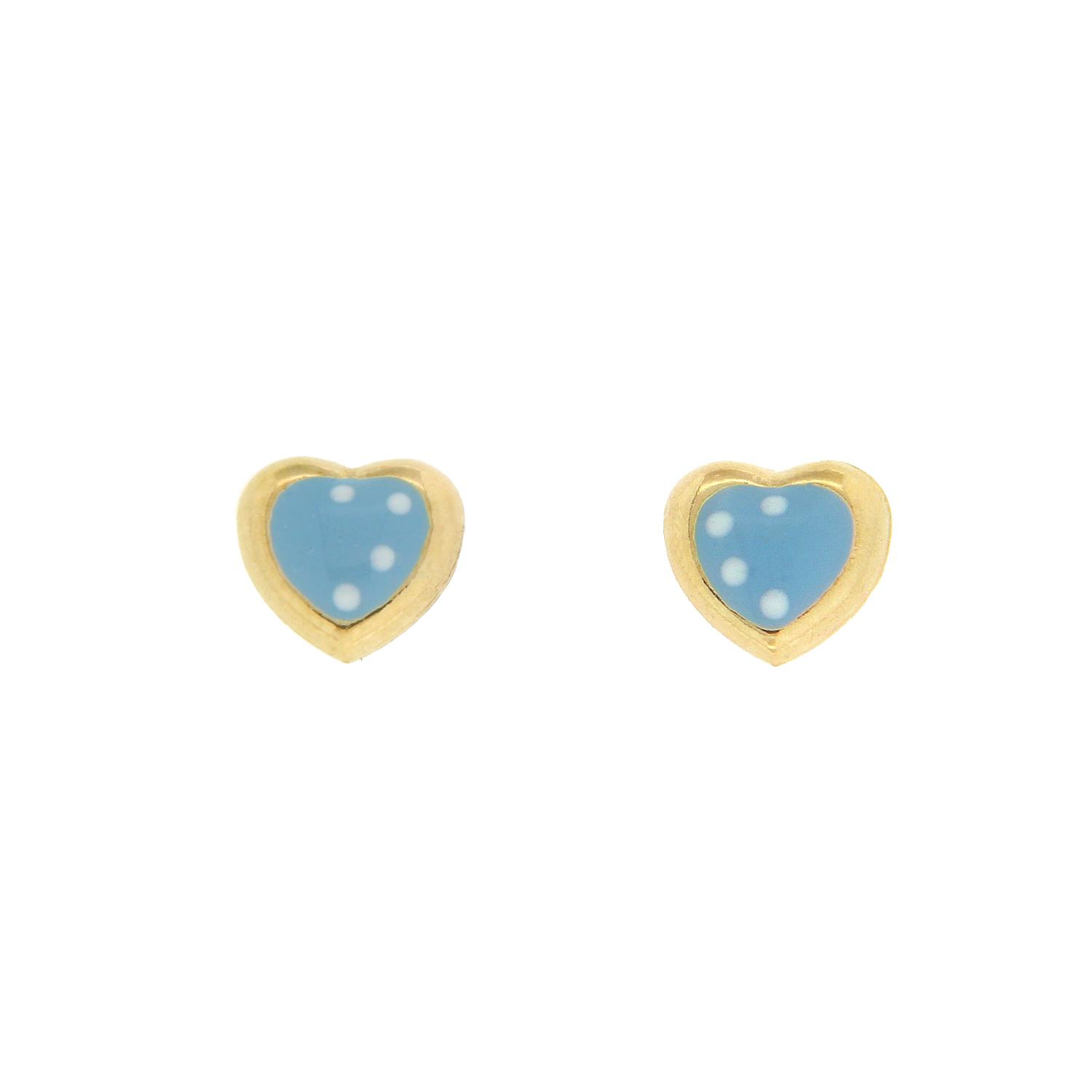 Minimal, μοντέρνα σκουλαρίκια καρφωτά από κίτρινο χρυσό 14 καρατίων (κ585) σε σχήμα καρδιάς, από σμάλτο σε σιέλ χρώμα με άσπρες βούλες.