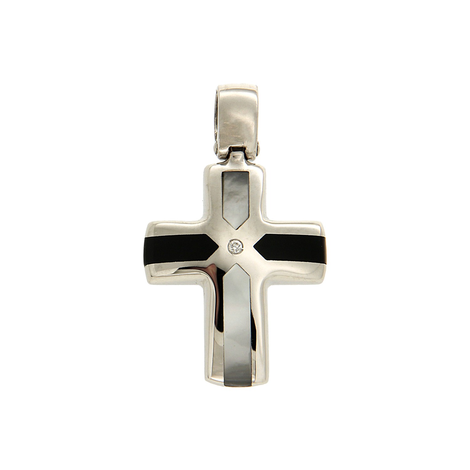Σταυρός διαχρονικός, γυαλιστερός από λευκόχρυσο 14 καρατίων. Ο σταυρός ε'ιναι ασπρόμαυρος με καμπύλες καισ το κέντρο του υπάρχει ένα ζιργκόν.