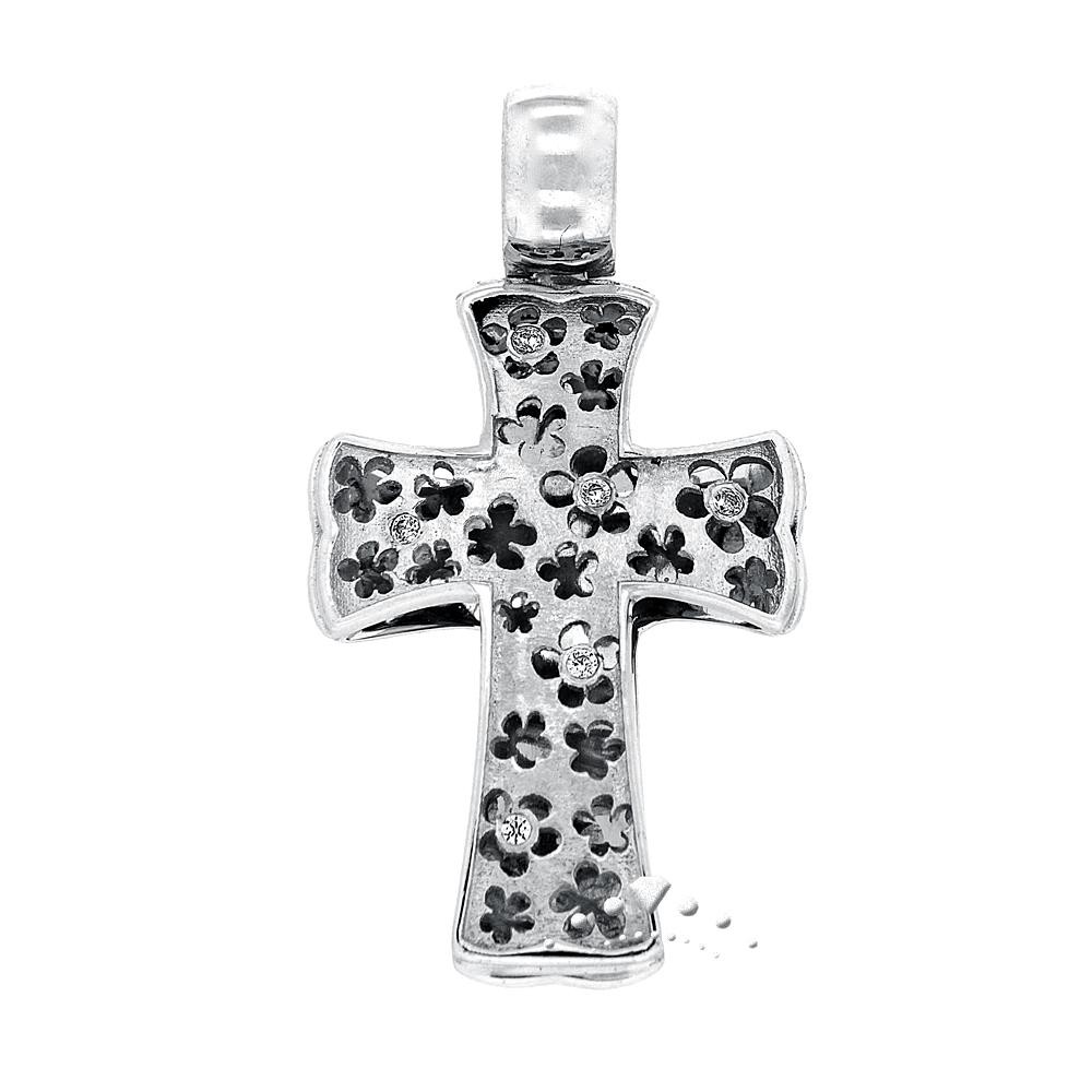 Σταυρός μοντέρνος, λευκόχρυσος 14 καρατίων (κ585). Στον σταυρό υπάρχουν διάσπαρτα ζιργκόν, όλα εξαιρετικής ποιότητας που δίνουν στο κόσμημα αστραφτερή λάμψη.