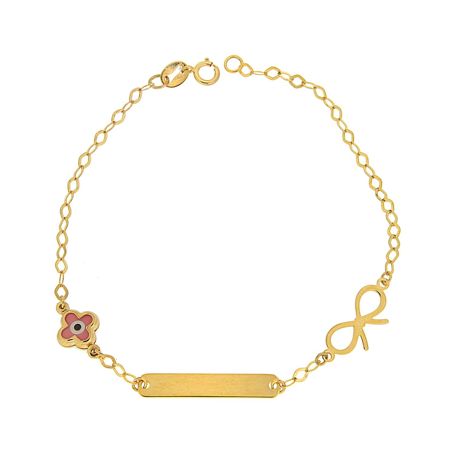 Minimal, γυαλιστερή παιδική ταυτότητα από χρυσό 14 καρατίων (585). Η πλάκα της ταυτότητας είναι σκέτη και γυαλιστερή και αμφίπλευρά της περιέχει ένα μάτι ροζ σε σταυρό και κορδέλα σκέτα και γυαλιστερά και τα δύο.