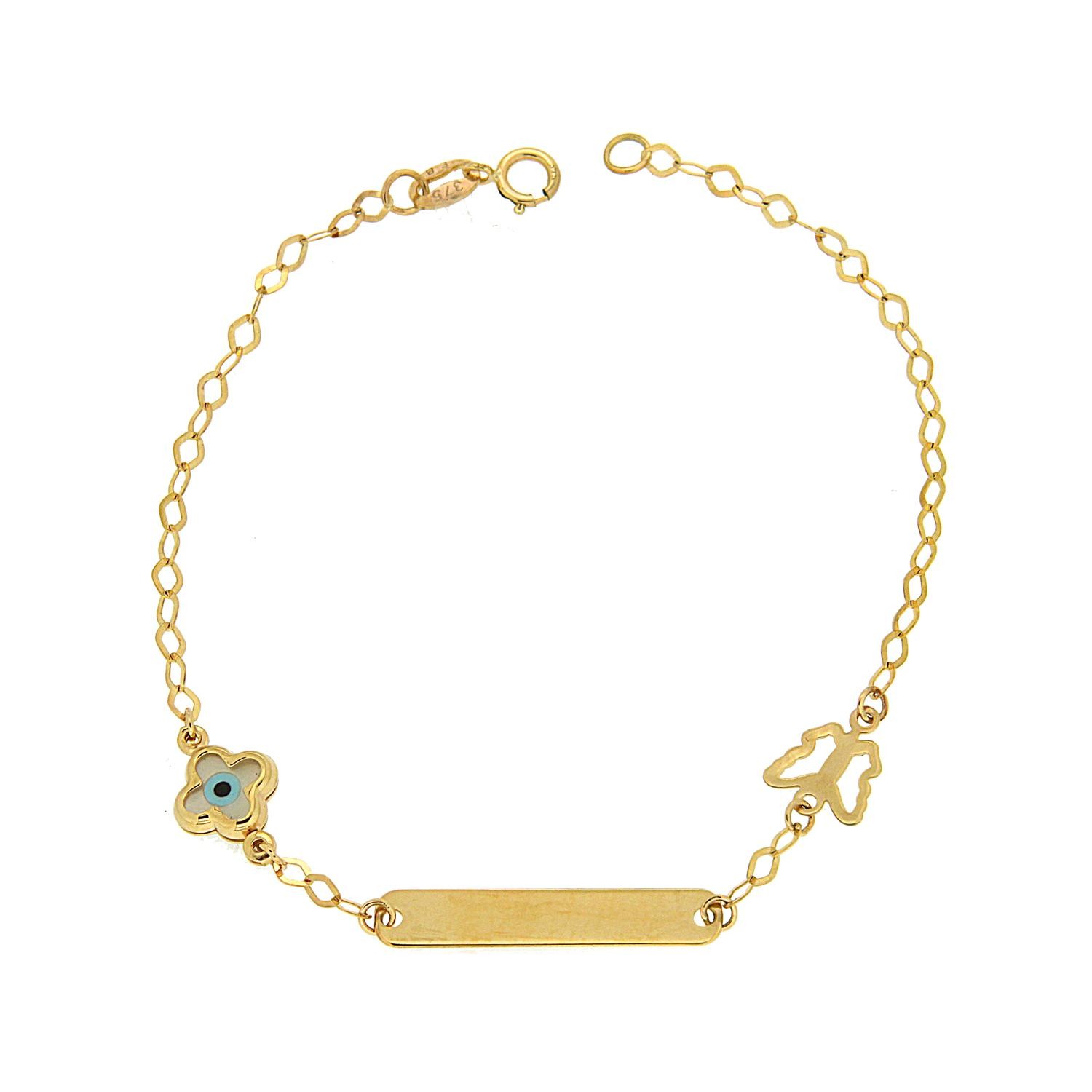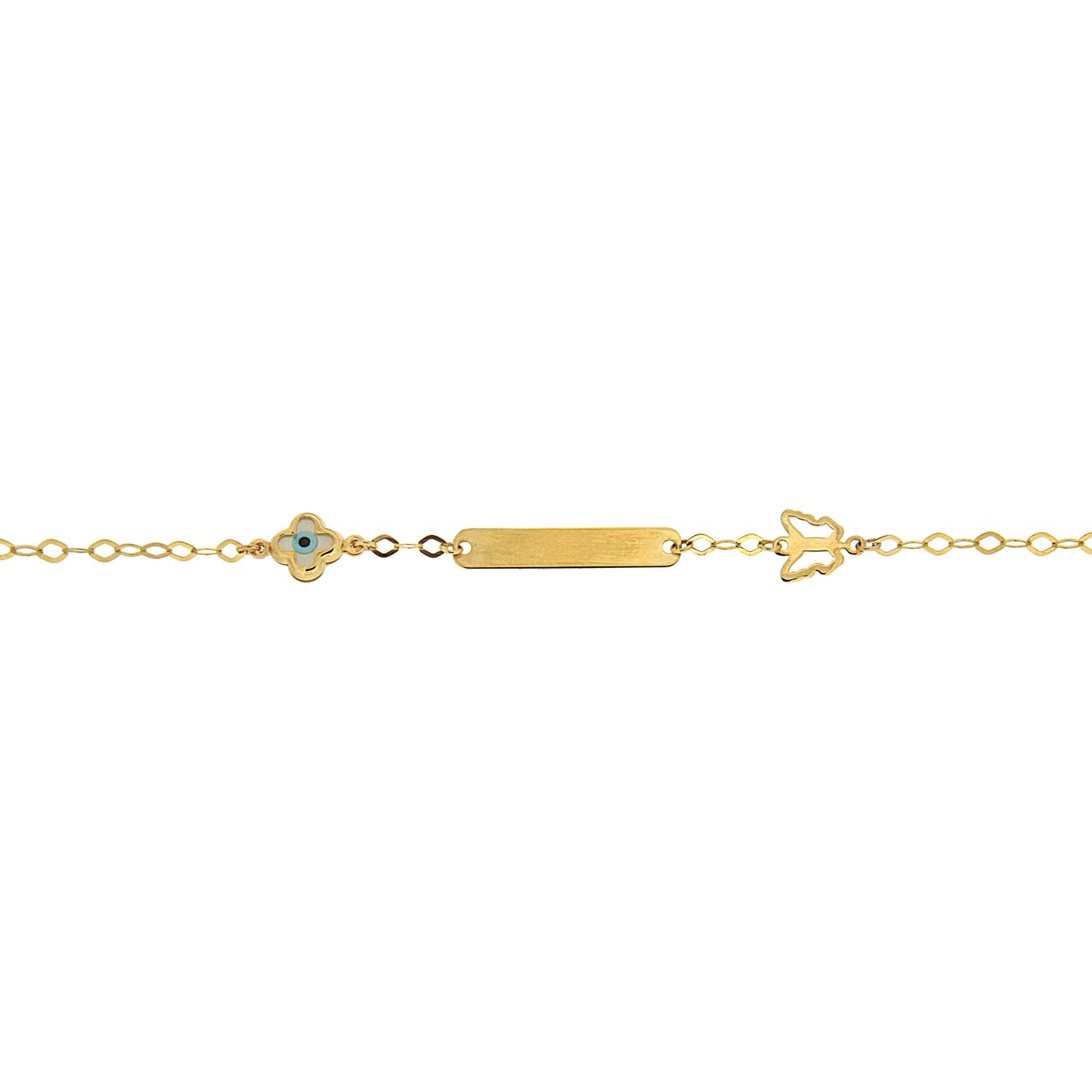 Minimal, γυαλιστερή παιδική ταυτότητα από χρυσό 14 καρατίων (585). Η πλάκα της ταυτότητας είναι σκέτη και γυαλιστερή και αμφίπλευρά της περιέχει ένα μάτι σε σταυρό και πεταλούδα σκέτα και γυαλιστερά και τα δύο.