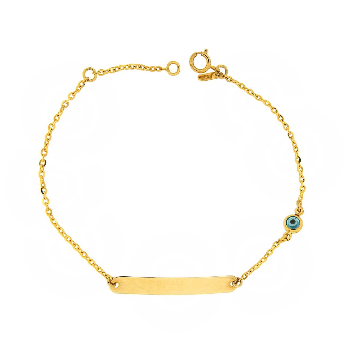 Minimal, γυαλιστερή παιδική ταυτότητα από χρυσό 9 καρατίων. Η πλάκα της ταυτότητας είναι σκέτη γυαλιστερή και δίπλα της περαστή επάνω στην αλυσίδα βρίσκεται ένα charm μάτι στρόγγυλο σε μπλε χρώμα.