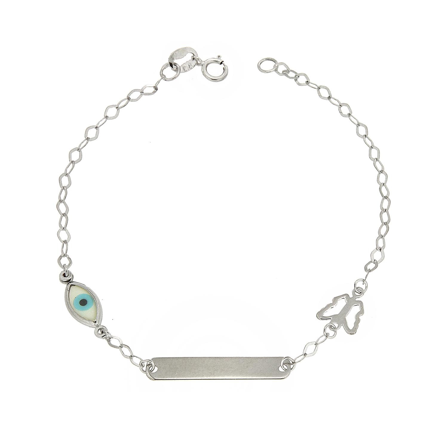 Minimal, γυαλιστερή παιδική ταυτότητα από λευκόχρυσο 14 καρατίων (585). Η πλάκα της ταυτότητας είναι σκέτη και γυαλιστερή και αμφίπλευρά της περιέχει ένα μάτι και πεταλούδα σκέτα και γυαλιστερά και τα δύο.