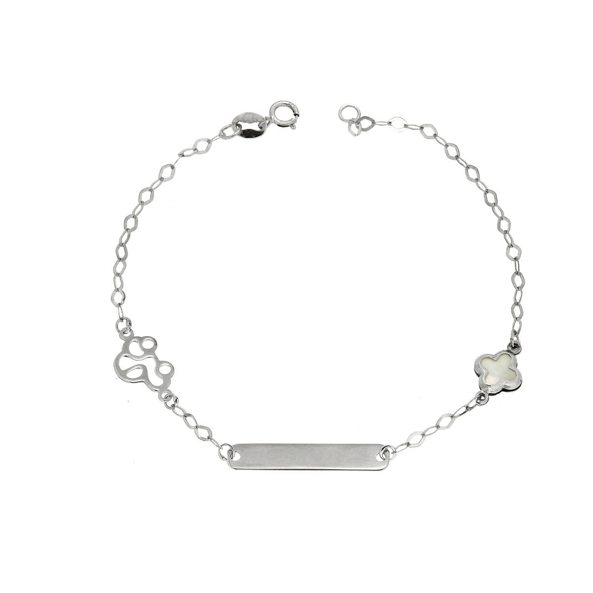 Minimal, γυαλιστερή παιδική ταυτότητα από λευκόχρυσο 14 καρατίων. Η πλάκα της ταυτότητας είναι σκέτη γυαλιστερή και αμφίπλευρά της υπάρχουν ένα αυτοκίνητο και ένας σταυρός λευκός.