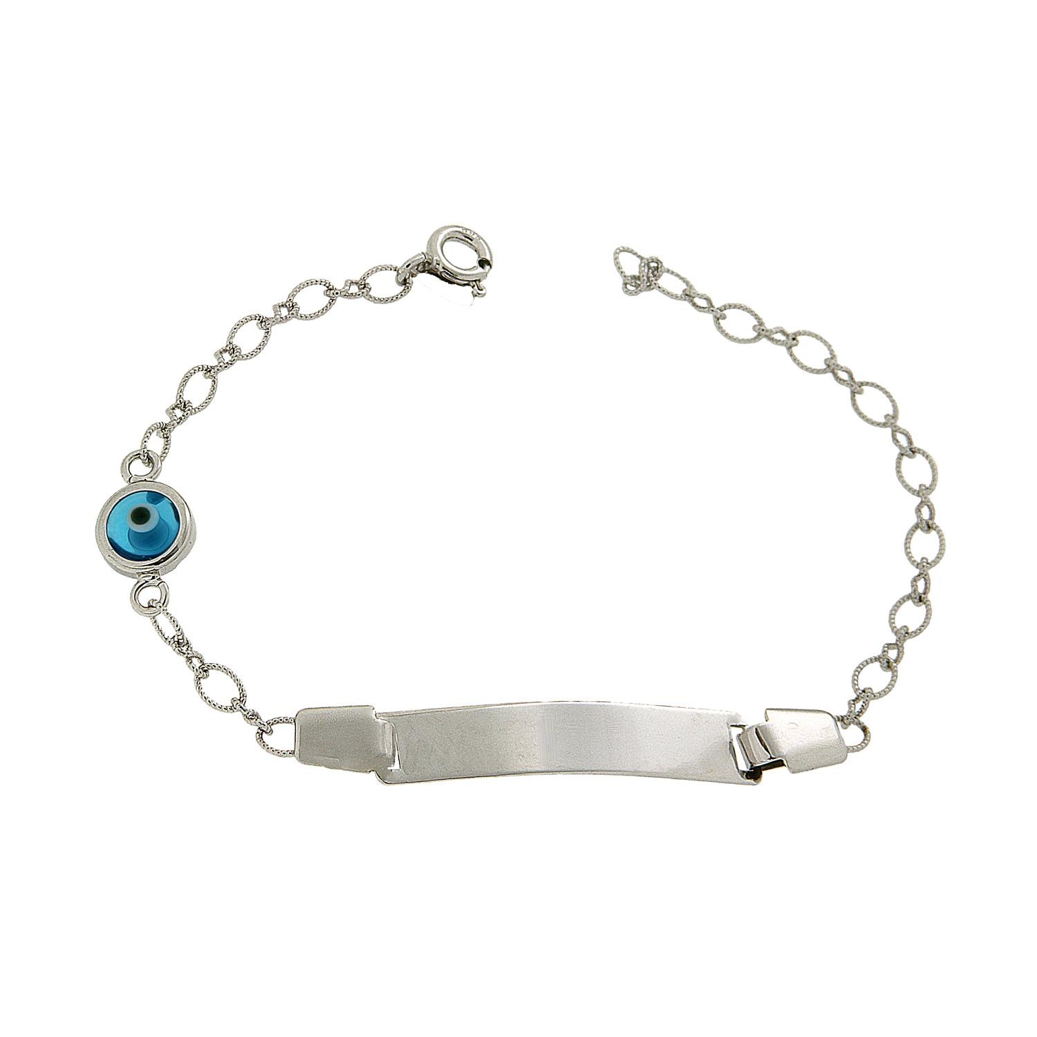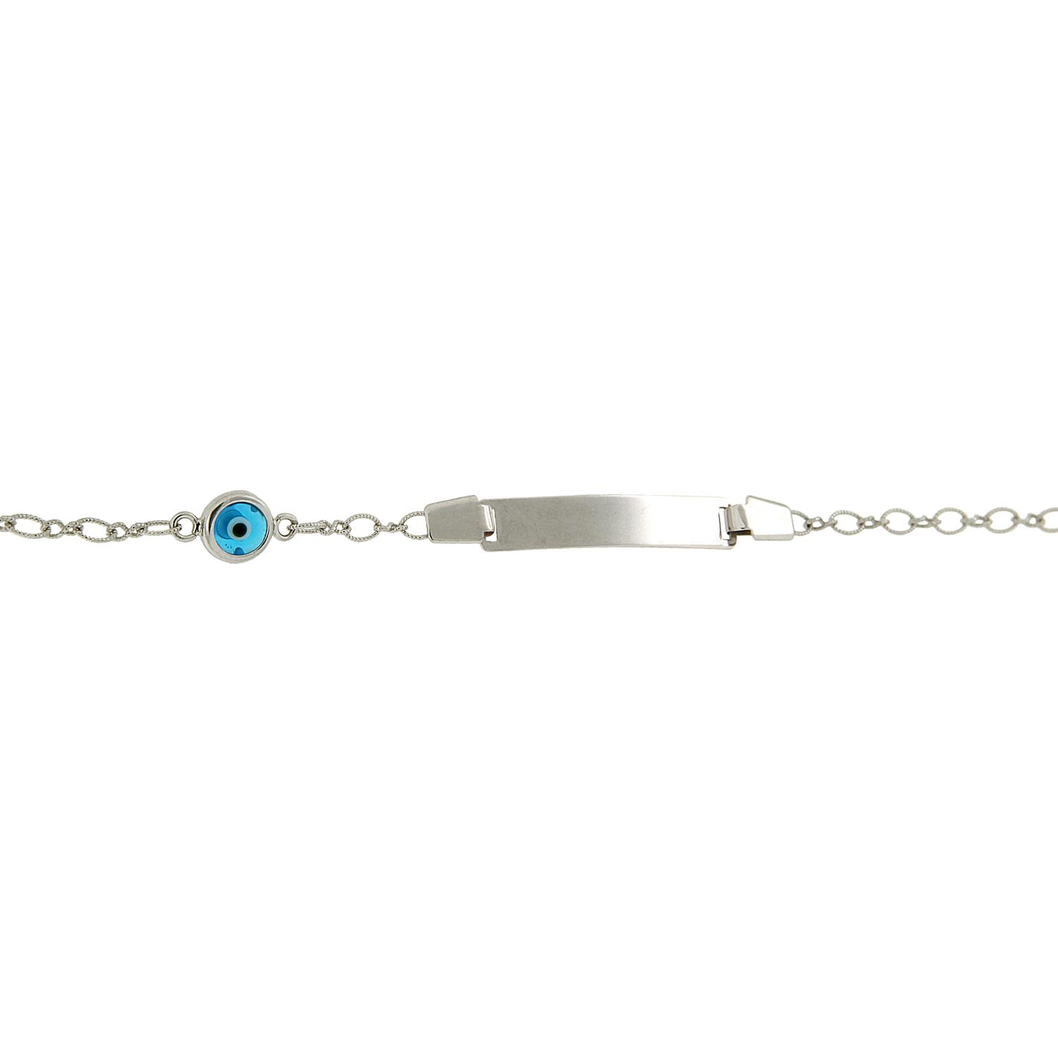 Iδιαίτερα εντυπωσιακό και minimal βραχιόλι ταυτότητα από λευκόχρυσο 14 καρατίων με αλυσίδα με κρίκους. Το κούμπωμα μπορεί να κουμπώσει σε όλους τους κρίκους και να προσαρμοστεί εύκολα ακόμη και σε λεπτό παιδικό καρπό. Η πλάκα της ταυτότητας είναι σκέτη και γυαλιστερή και επάνω στην αλυσίδα είναι ενσωματωμένο ένα σκέτο μάτι στρόγγυλο.
