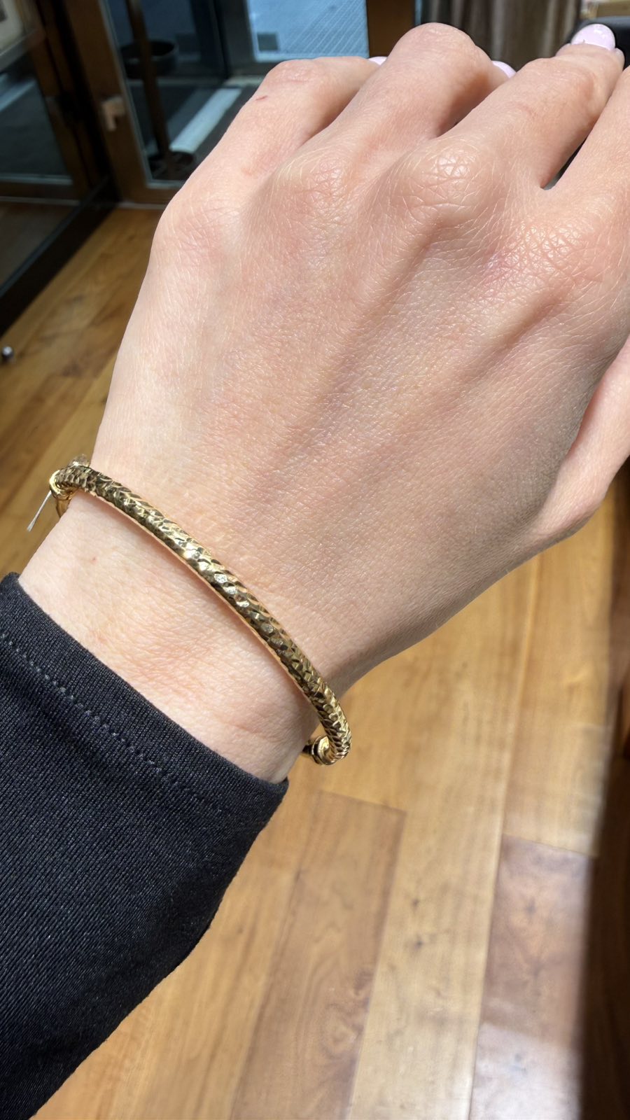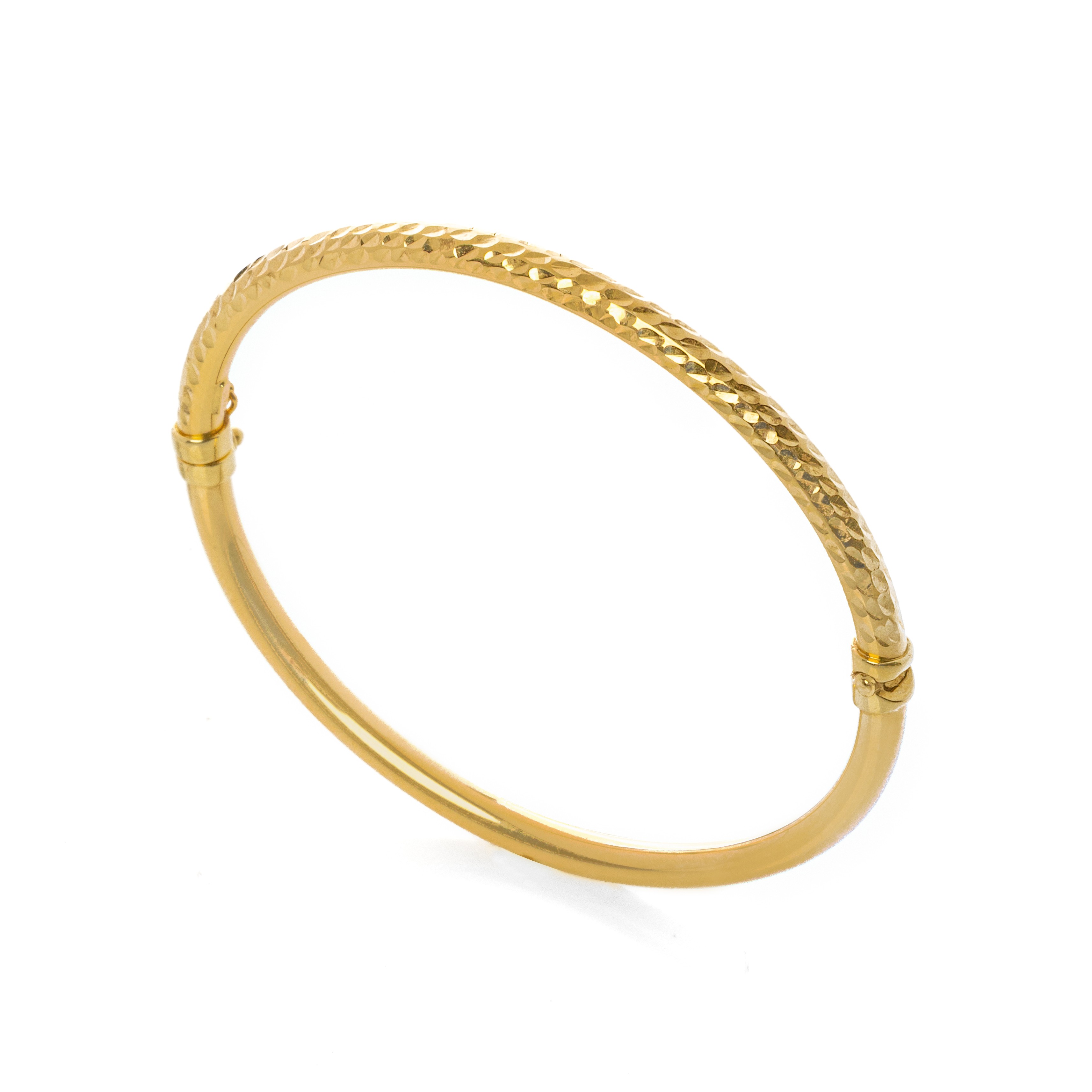 Βραχιόλι σταθερό, χειροπέδη από κίτρινο χρυσό 14 καρατίων(585). Το βραχιόλι είναι διπλής όψης με σκάλισμα στη μισή της επιφάνεια. Διαθέτει κούμπωμα ασφαλείας.