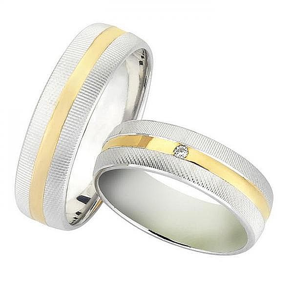 Ζευγάρι βέρες Bonise, δίχρωμες από χρυσό και λευκόχρυσο 14 καρατίων, η γυναικεία με διαμάντι. Σχέδιο f3821