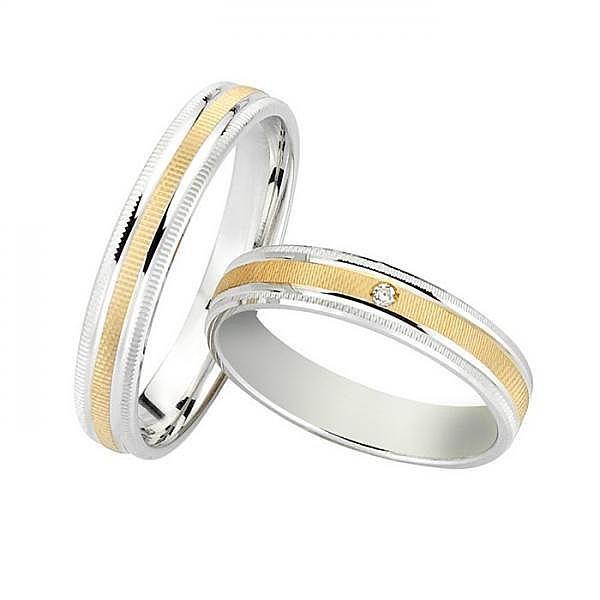 Ζευγάρι βέρες Bonise, δίχρωμες από χρυσό και λευκόχρυσο 14 καρατίων, η γυναικεία με πέτρα ζιργκόν. Σχέδιο f3822