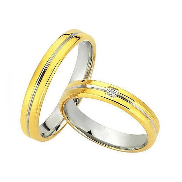 Ζευγάρι βέρες Bonise, δίχρωμες από χρυσό και λευκόχρυσο 14 καρατίων, η γυναικεία με πέτρα ζιργκόν. Σχέδιο wd12040ia
