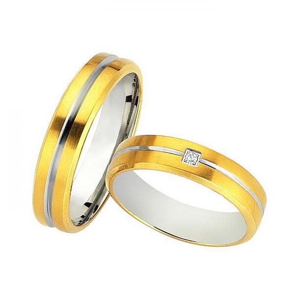 Ζευγάρι βέρες Bonise, δίχρωμες από χρυσό και λευκόχρυσο 14 καρατίων, η γυναικεία με πέτρα ζιργκόν. Σχέδιο wd12050ia