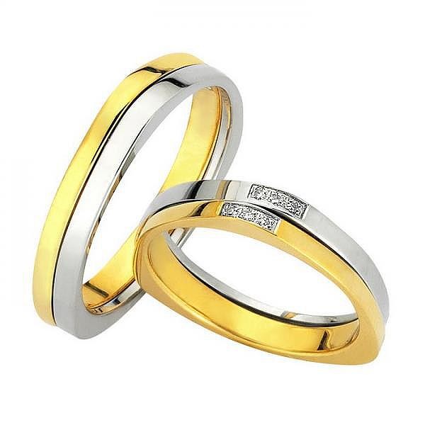 Βέρες δίχρωμες, ασύμμετρες, από κίτρινο χρυσό και λευκόχρυσο, 14 καρατίων (κ585), η γυναικεία με διαμάντι βάρους 0,015ct (μπριγιάν) και ποιότητα F/VS1. Η κάθε μια από τις βέρες αποτελείται από δύο άλλες, μία λευκόχρυση και μια χρυσή, που περιστρέφονται η κάθε μία χωριστά.