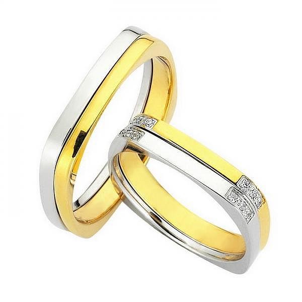 Ζευγάρι βέρες Bonise, δίχρωμες από κίτρινο χρυσό και λευκόχρυσο 14 καρατίων, η γυναικεία με πέτρα ζιργκόν. Σχέδιο bv104105an