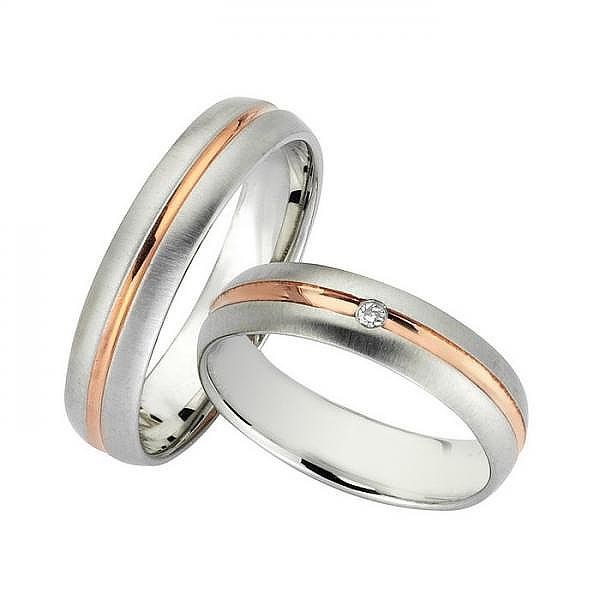 Βέρες Bonise, δίχρωμες από ροζ χρυσό και λευκόχρυσο, 14 καρατίων (κ585), η γυναικεία με διαμάντι βάρους 0,015ct (μπριγιάν) και ποιότητα F/VS1.