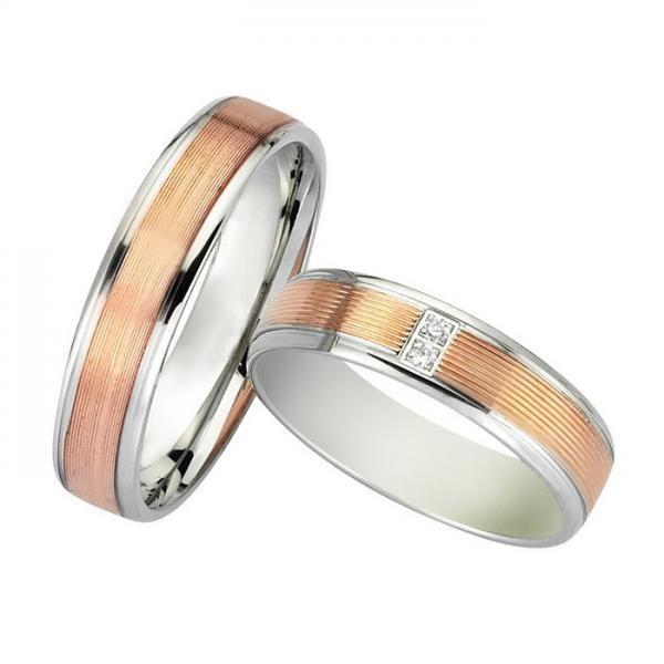 Βέρες Bonise, δίχρωμες από ροζ χρυσό και λευκόχρυσο, 14 καρατίων (κ585), η γυναικεία με διαμάντι βάρους 0,015ct (μπριγιάν) και ποιότητα F/VS1.