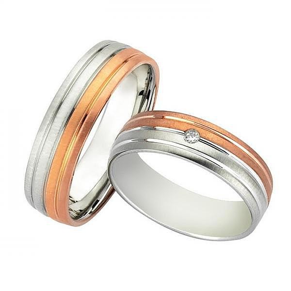 Βέρες Bonise, δίχρωμες από ροζ χρυσό και λευκόχρυσο, 14 καρατίων (κ585), η γυναικεία με πέτρα ζιργκόν.