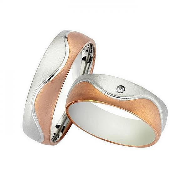 Ζευγάρι βέρες Bonise, δίχρωμες από ροζ χρυσό και λευκόχρυσο 14 καρατίων, η γυναικεία με πέτρα ζιργκόν. Σχέδιο wd239460dm