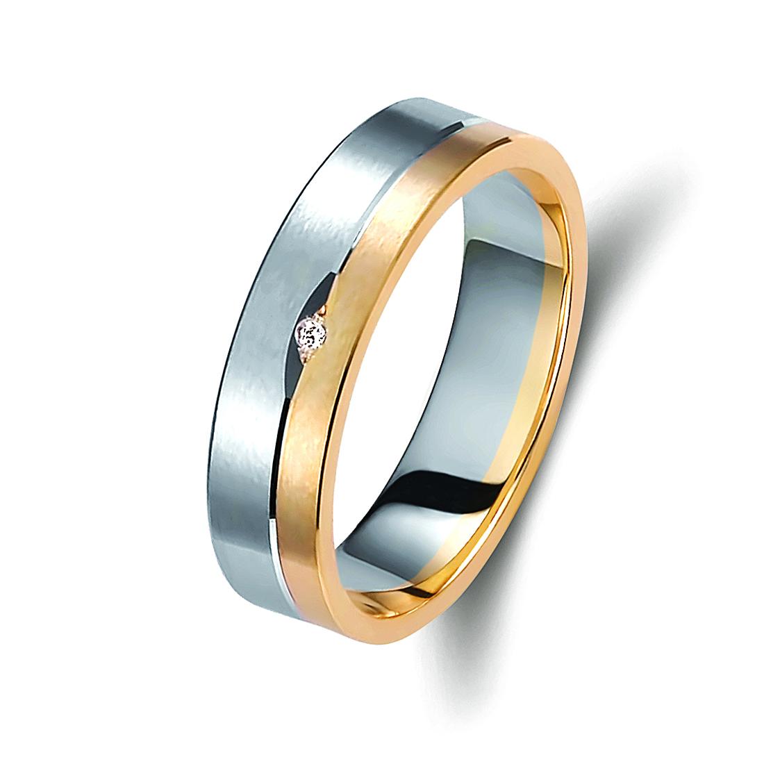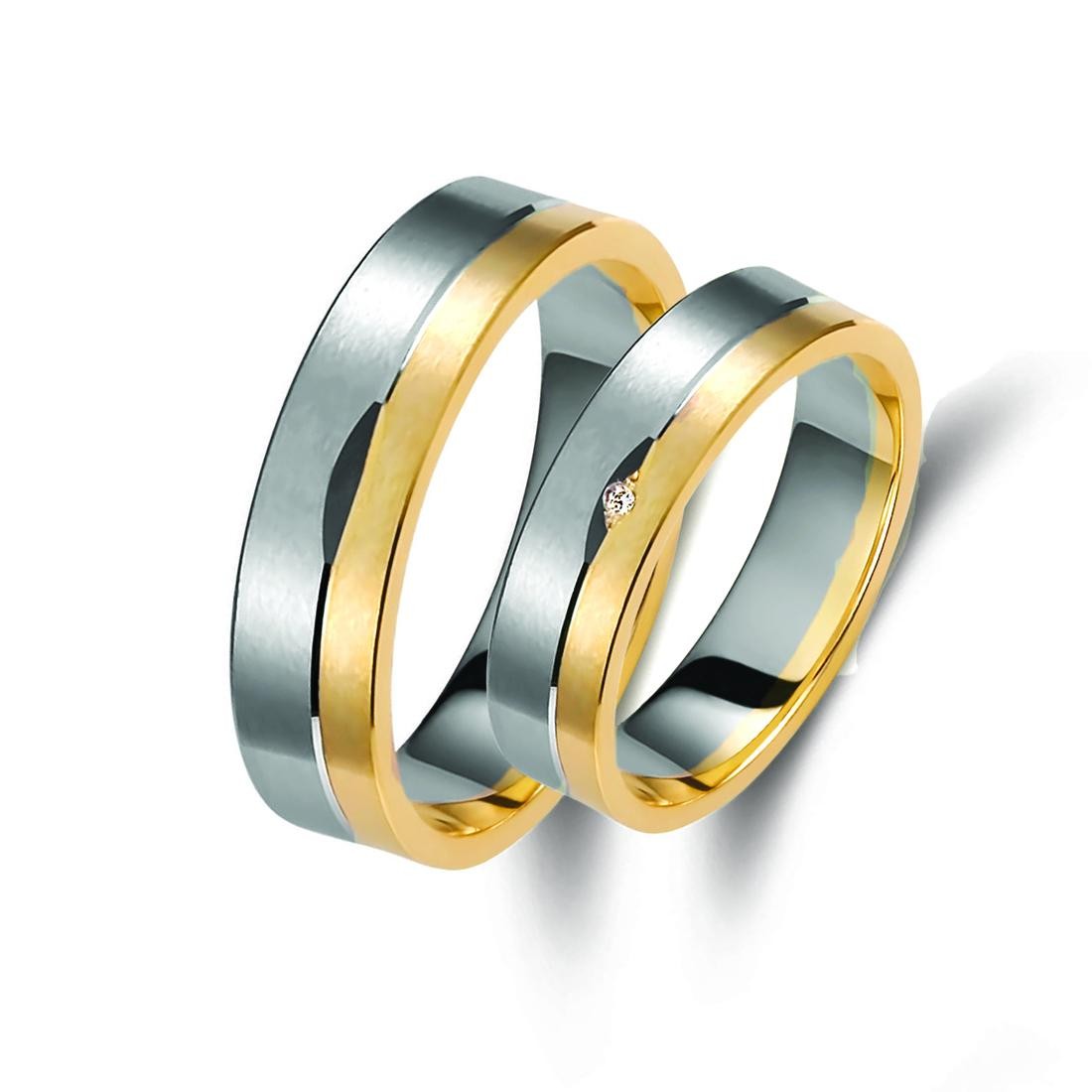 Ζευγάρι βέρες δίχρωμες από λευκό και κίτρινο χρυσό 14 καρατίων, η γυναικεία με διαμάντι βάρους 0,015ct (μπριγιάν) και ποιότητα F/VS1.