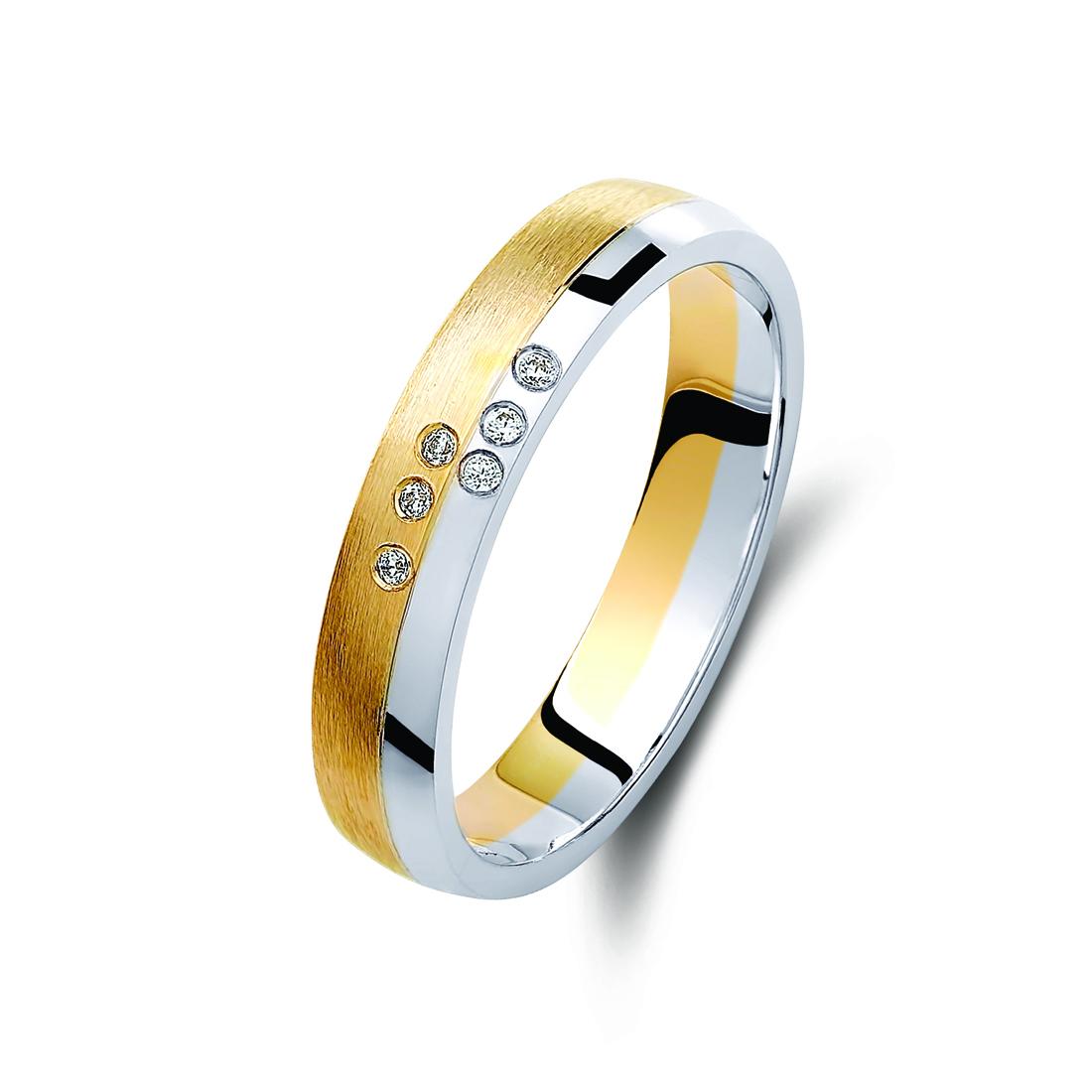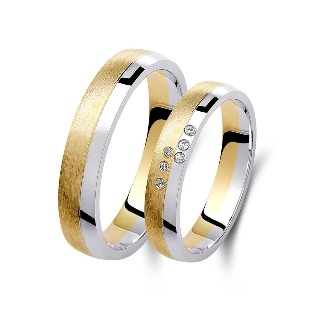Ζευγάρι βέρες δίχρωμες από λευκό και κίτρινο χρυσό 14 καρατίων, η γυναικεία με διαμάντι βάρους 0,015ct (μπριγιάν) και ποιότητα F/VS1.