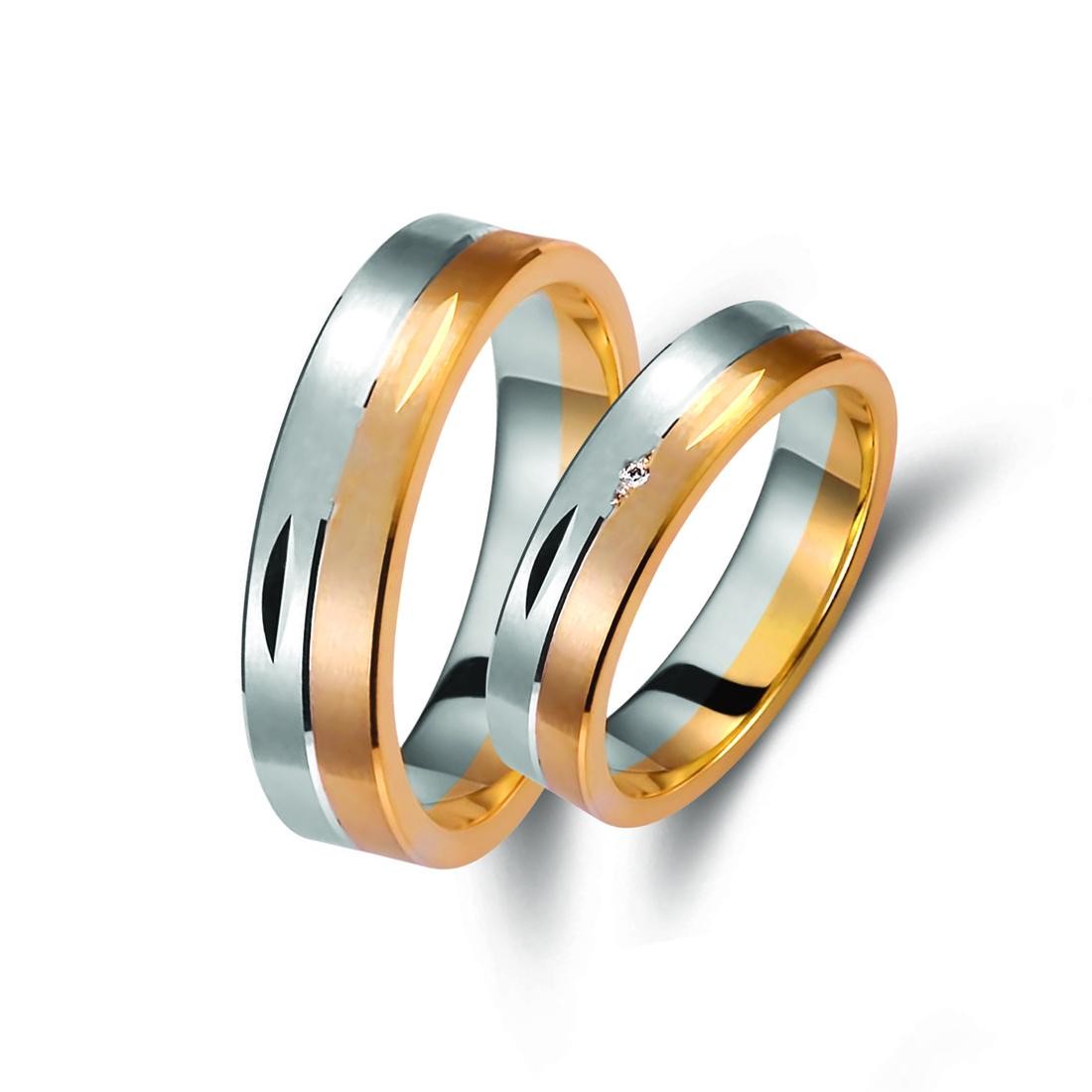 Ζευγάρι βέρες από λευκό και ροζ χρυσό 8 καρατίων, η γυναικεία με διαμάντι βάρους 0,015ct (μπριγιάν) και ποιότητα F/VS1.
