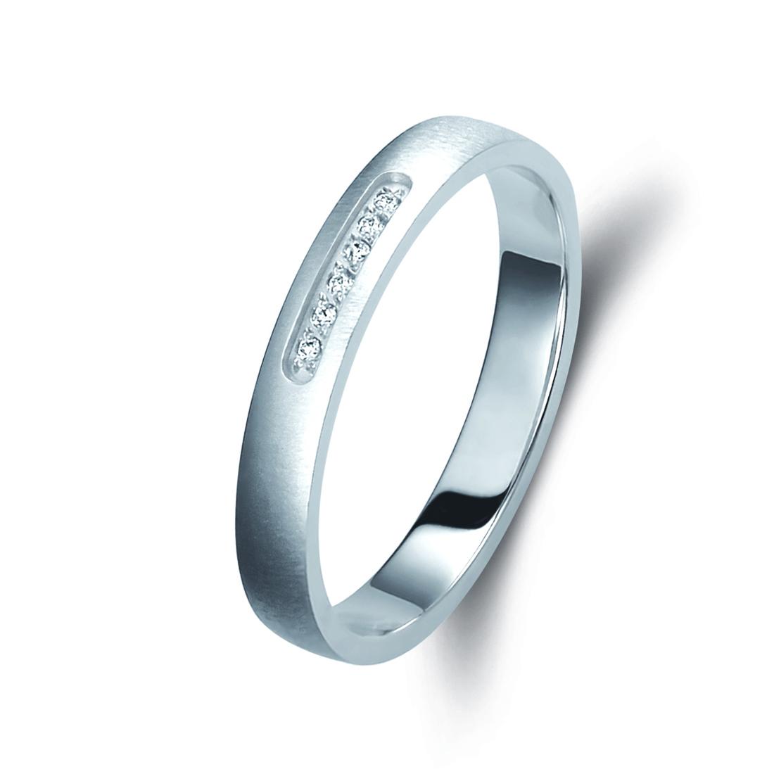 Ζευγάρι βέρες λευκόχρυσες 14 καρατίων, η γυναικεία με διαμάντι βάρους 0,015ct (μπριγιάν) και ποιότητα F/VS1.
