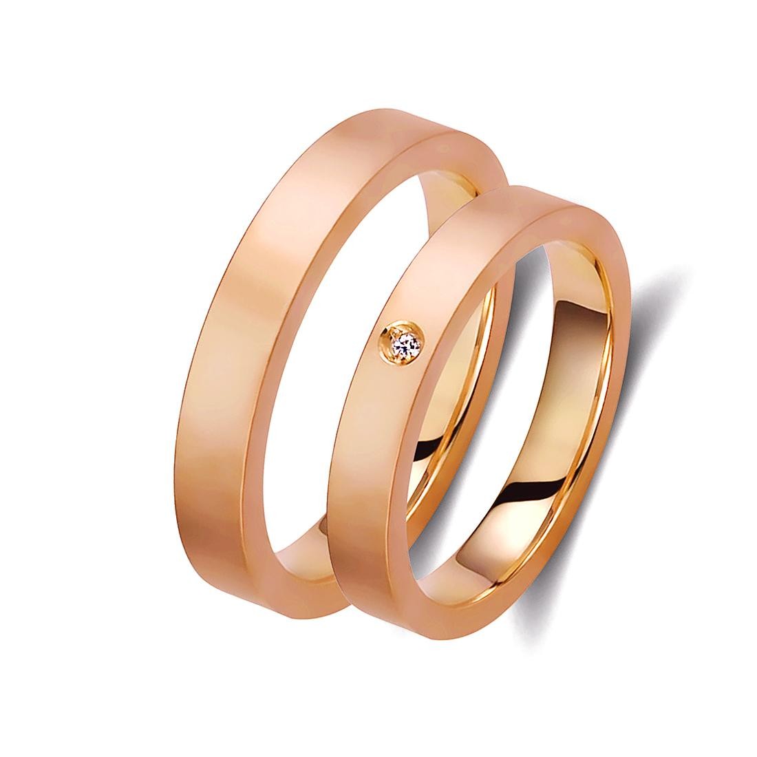 Ζευγάρι βέρες ροζ χρυσό 18 καρατίων (k585), η γυναικεία με διαμάντι βάρους 0,015ct (μπριγιάν) και ποιότητα F/VS1.